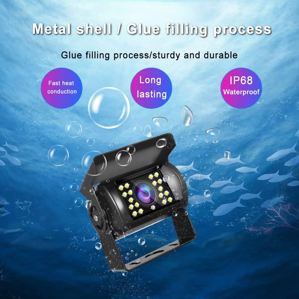 - 【IP68 Waterproof Reverse Camera (No Guide Lines)】Hard Metal Cased Camera, waterproof and Mud proof. 18 IR LEDs for Night Vision + 120° horizontal wide view angle + 180°vertical adjustable angle to view the blind spots. You can get it work Full Time when connect to constant power source