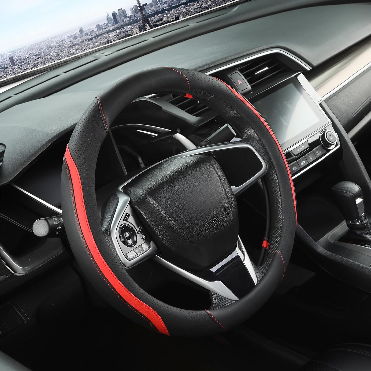 Car Steering Wheel Cover, Leather Steering Wheel Cover Red Universal 14.5-15 Inch Microfiber Leather Anti-Slip Breathable Auto Steering Wheel Covers for Men Women (Black&Red)