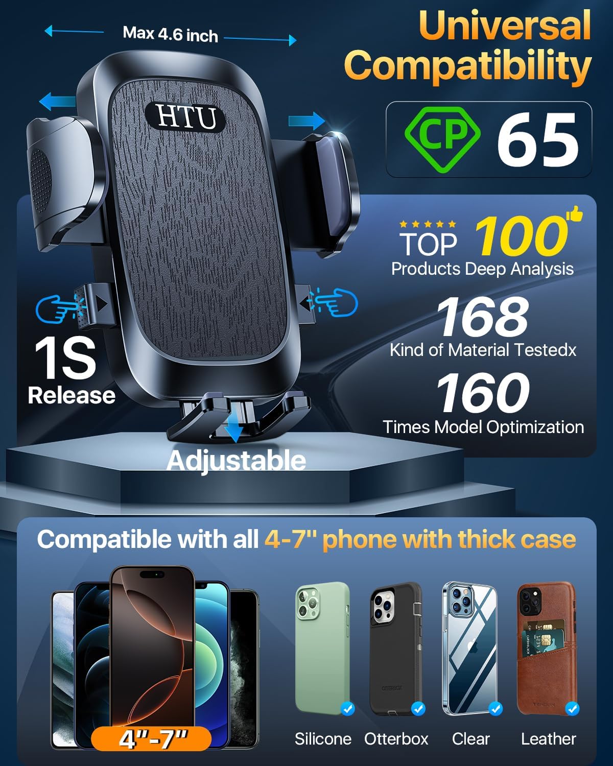 - [Good Choice: High-End Car Mount Trusted by 2,500,000+ Users over 15 Years] 2025 HTU car phone holder is certified by all authorities (International Military-Grade Shockproof Cert , CP65, REACH, RoHS), based on Unique Grandmaster Design (EUIPO Patent), TOP Durable & Healthy Materials from 4,000+ materials & Industry-Leading Safety Tests (Monthly 5,000+ open/close test; 10,000+ vibration resistance; 100,000+km rugged road tests; -40°F to 203°F laboratory test)