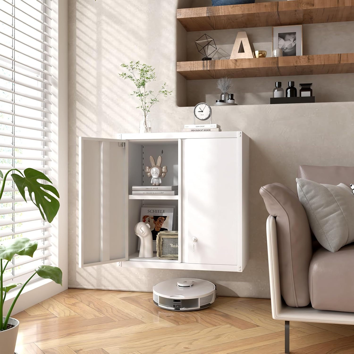 GREATMEET Metal Wall Cabinet, Wall Mounted Storage Cabinet with Lock for Garage Storage, White Floating Cabinet with Doors and Adjustable Shelf for Utility Room