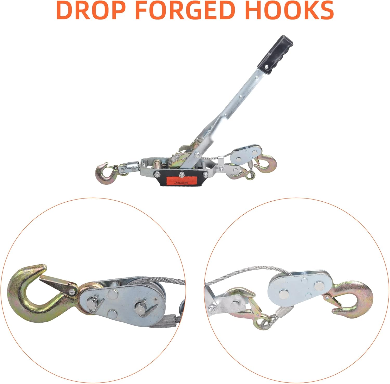 - ONE HANDED: The come along tool features dual laminated steel ratcheting gears pulley and double locking pawl that distributes even pulling force allowing you to use only one hand while pulling heavy loads. High-Leverage steel ratchet handle system with cushioned nonslip grip. You have more space to comfortably apply force and pull the load more easily.