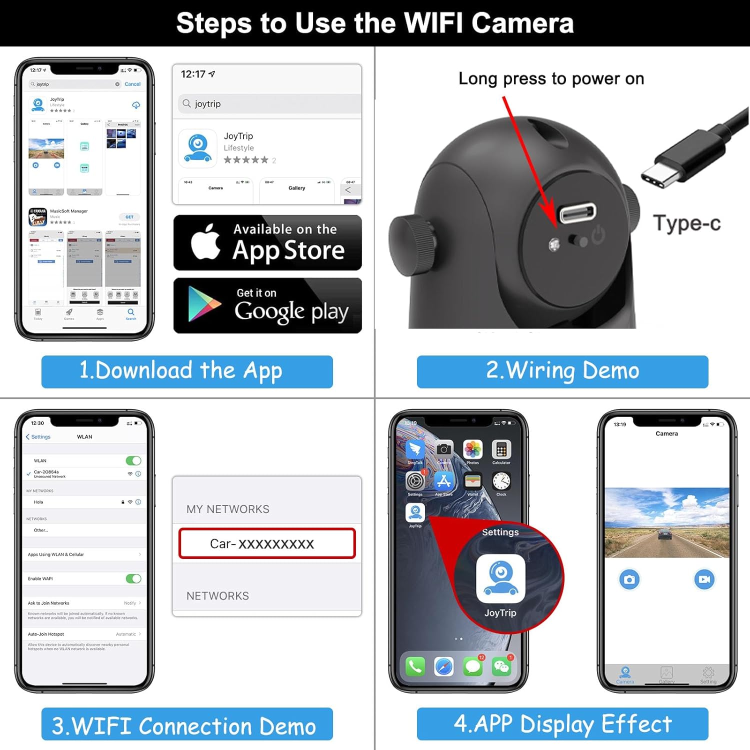 - ăReal-Time Front / Rear ViewăBack up camera can be installed in front of or behind the car to allow obstructions on the trail to be easily seen, with the live front / Rear view showing directly on your mobile device, allowing you to see the camera view on your smartphone/tablet. And you can record or playback important video clips at any time