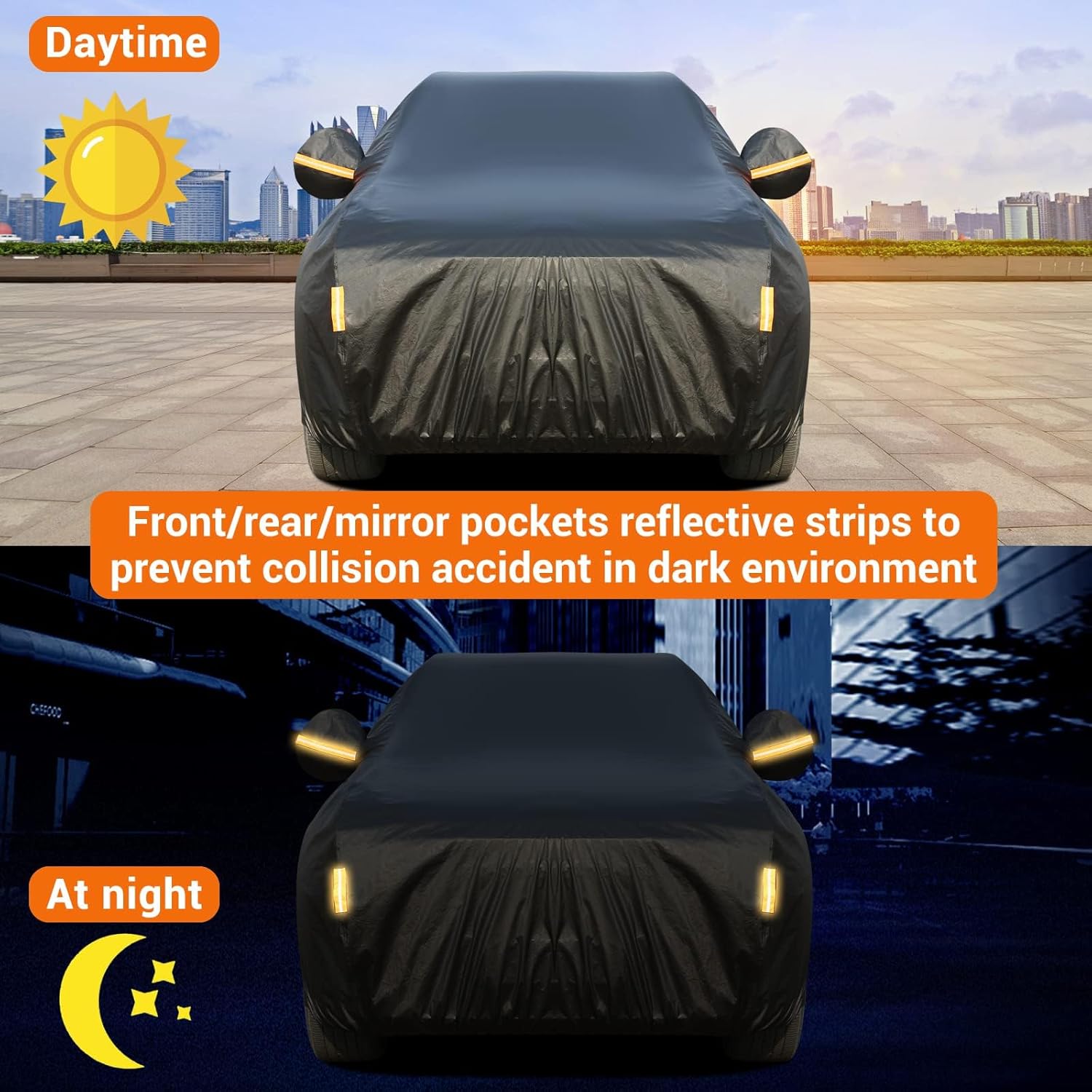 - Unique Design: DRIVER SIDE ZIPPER FOR EASY ACCESS. Front/rear windproof straps + double fixed buckles + Strong elastic hem help the car covers for automobiles stay secure and resist strong winds. 6 reflective strips alert others at night, professional mirror bag design. Precise and durable double stitched weatherproof full outdoor cover is more abrasion and tear resistant.