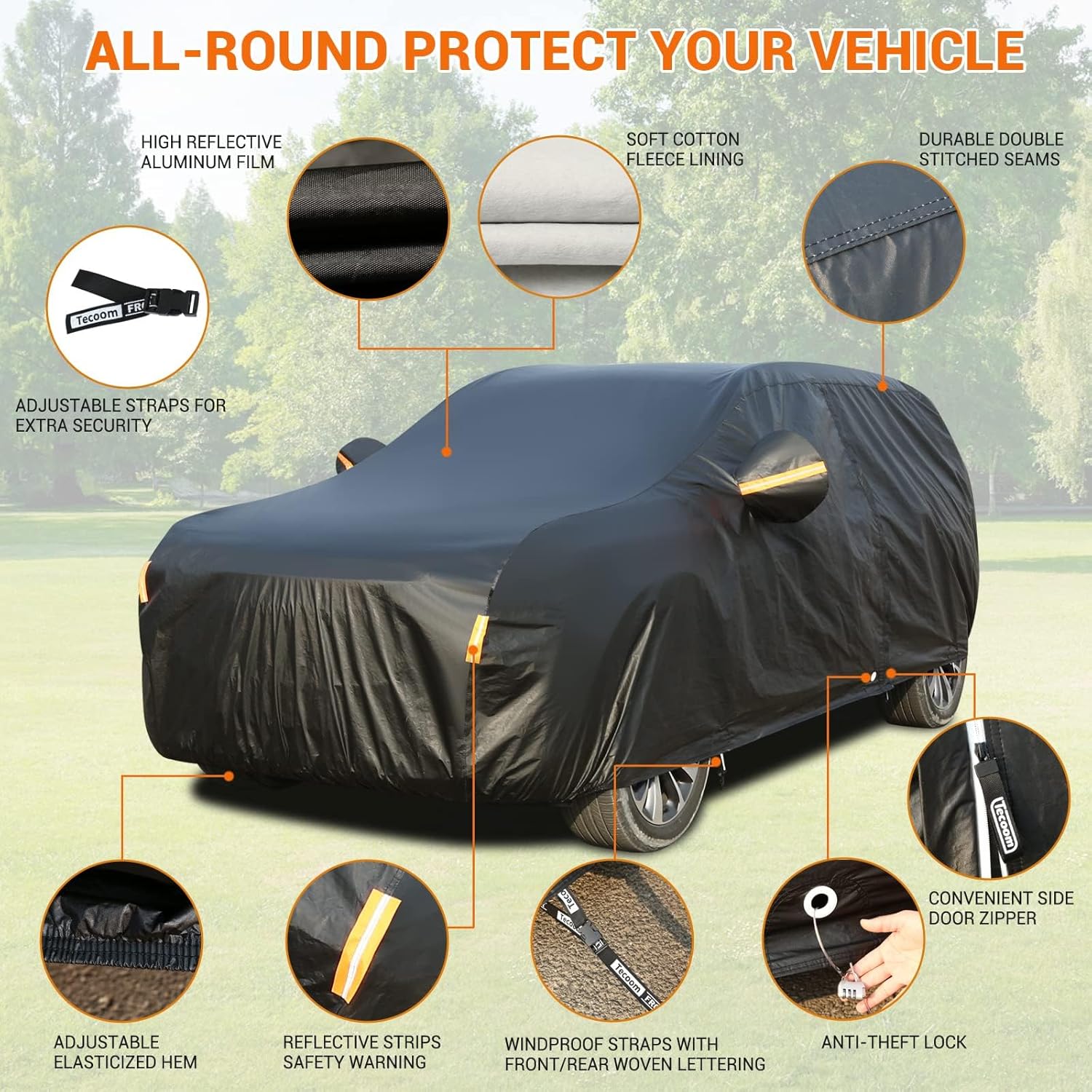 Tecoom Car Cover Waterproof All Weather, 3 Layers Car Covers for Automobiles with Lock/Zipper Door, Thick Fleece Lining UV Snow Rain Hail Protector Car Cover, Universal Fit for SUV (191-205 Inch)