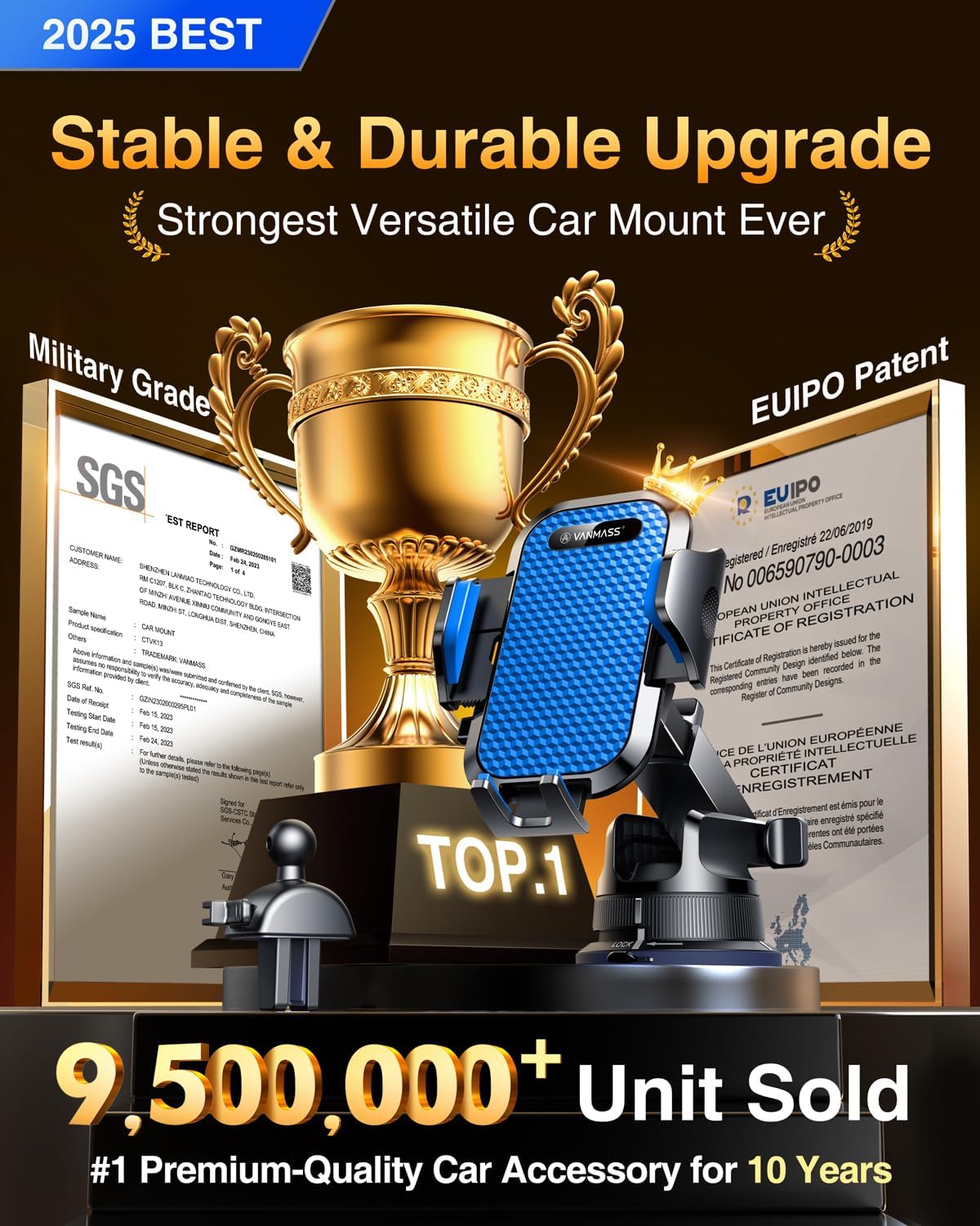 - 【Pro Version:VANMASS's Best Choice】VANMASS has been dedicated to car phone holder for 8 years, always leading the car holder industry in all aspects: safety, stability, durability, compatibility, multi-scene adaptability,climate friendly. The pro version mount enables the cutting-edge design team to create the best choice for customers- highest rating, most customers' preference, EU Intellectual Property Patent (No.007708805-0001), Military Grade Cert (No.GZMR220601855501), CP65/REACH/ROHS