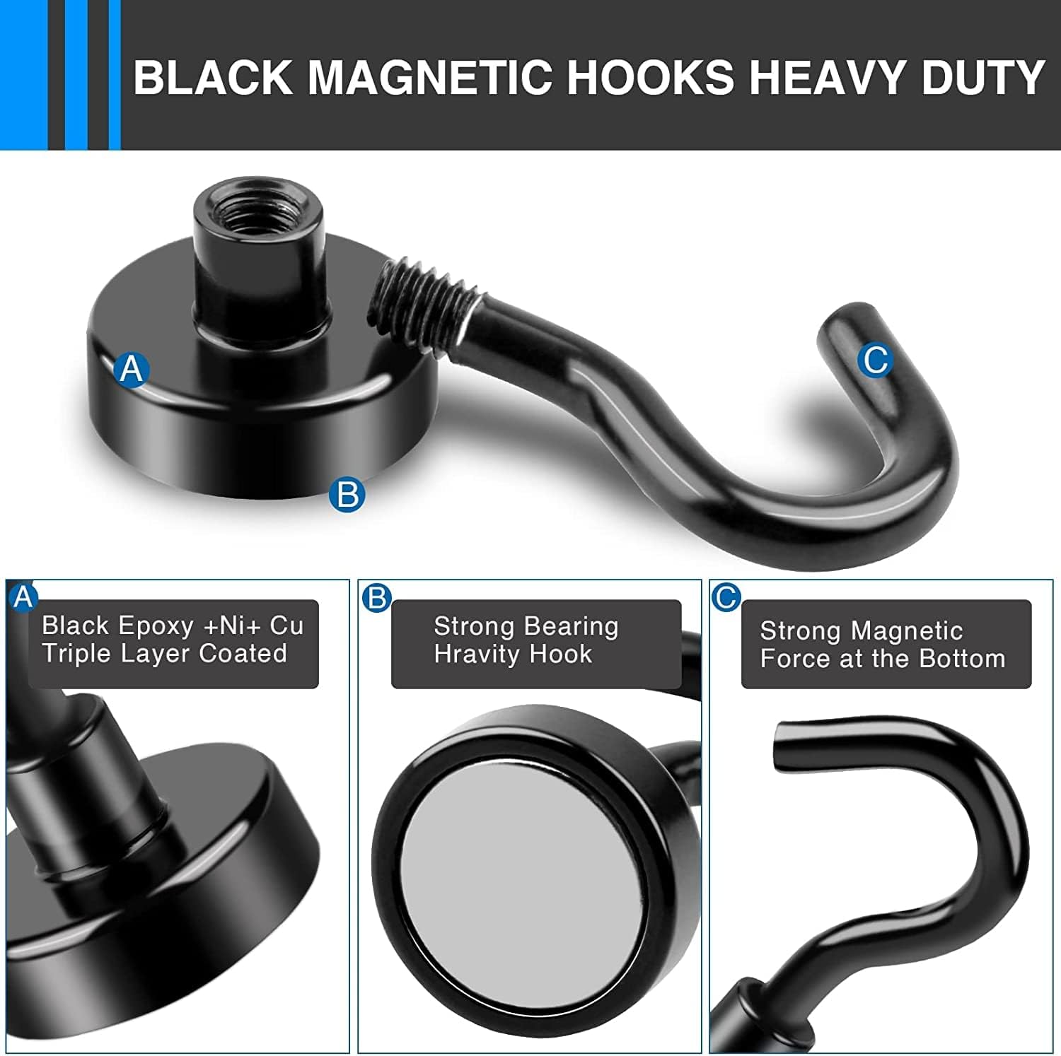 - 【BEST COATING】:Hook magnets are coated with Ni+Cu+Ni Triple Layer. The best coating available, which provides a shiny and rust resistant coated, provides protection for the magnetic hooks for hanging and helps magnetic hooks for classroom to prevent chipping or cracking.