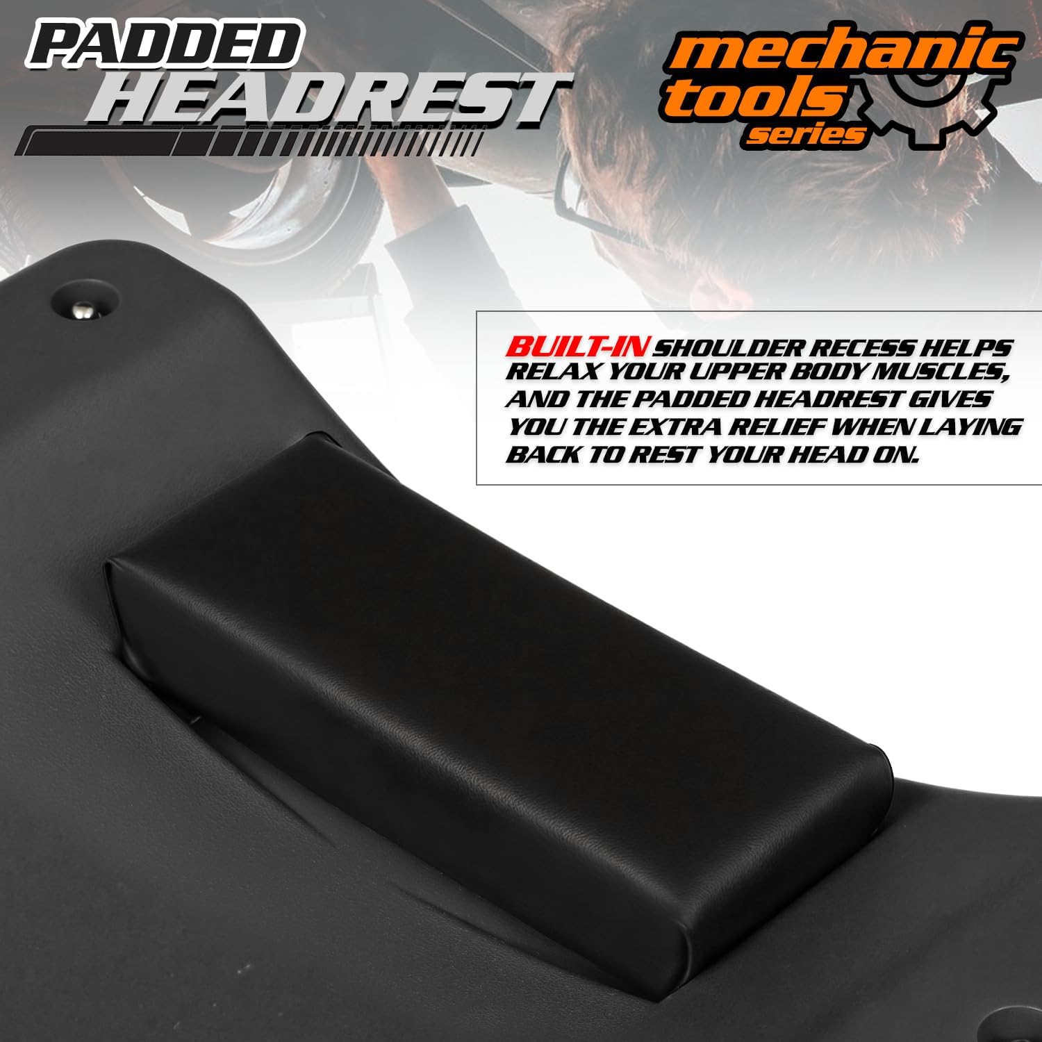 - Ergonomics Design - This advanced design give you more support from the frame when you sit slowly on the end of the creeper, and lay back to rest your head on the padded headrest to give you the extra relief.