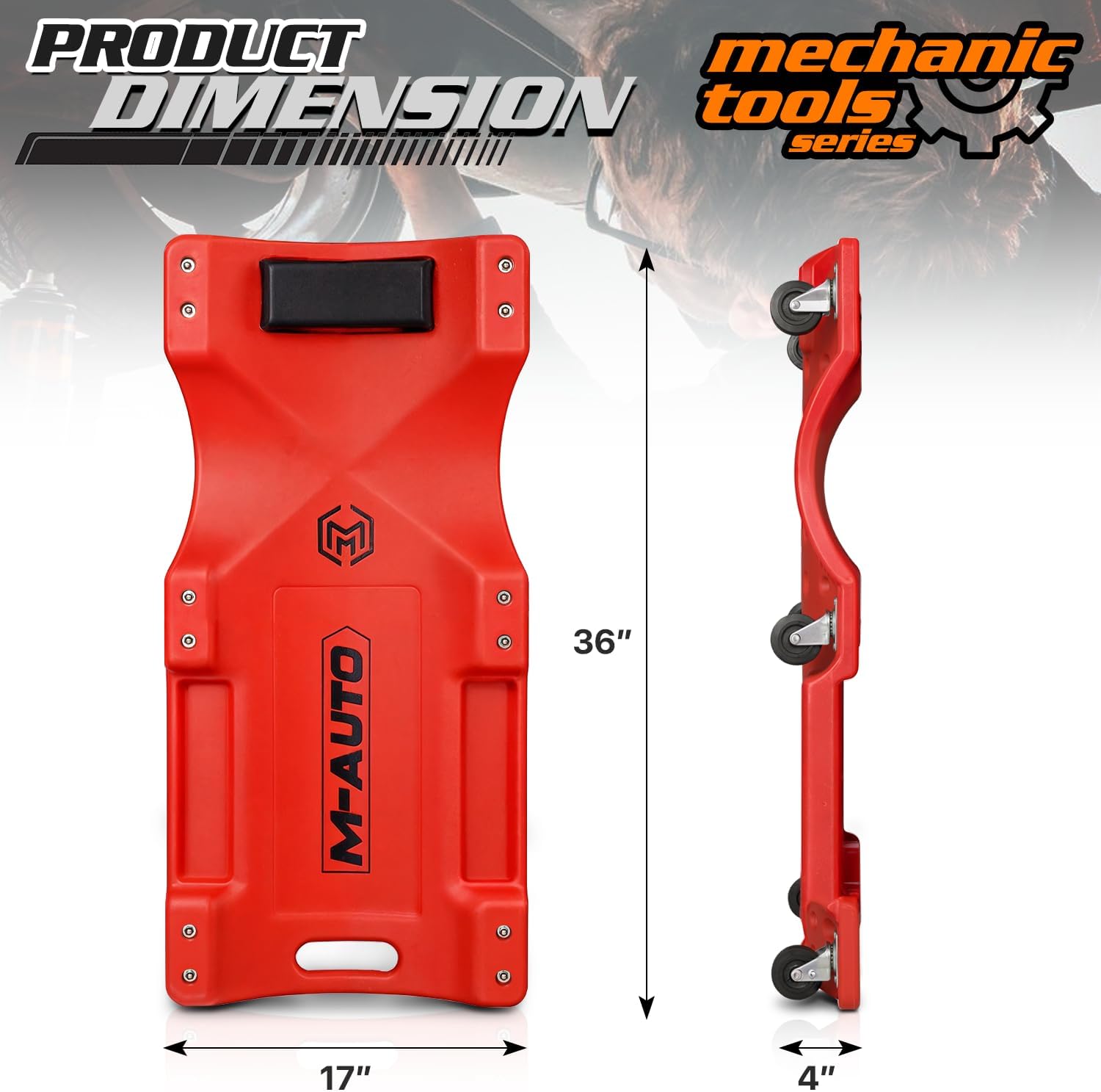 M-AUTO Plastic Rolling Garage Creeper with Padded Headrest 36" Light Weight Automotive Creeper Mechanic Cart with Dual Tool Trays and Noiseless Casters, Red