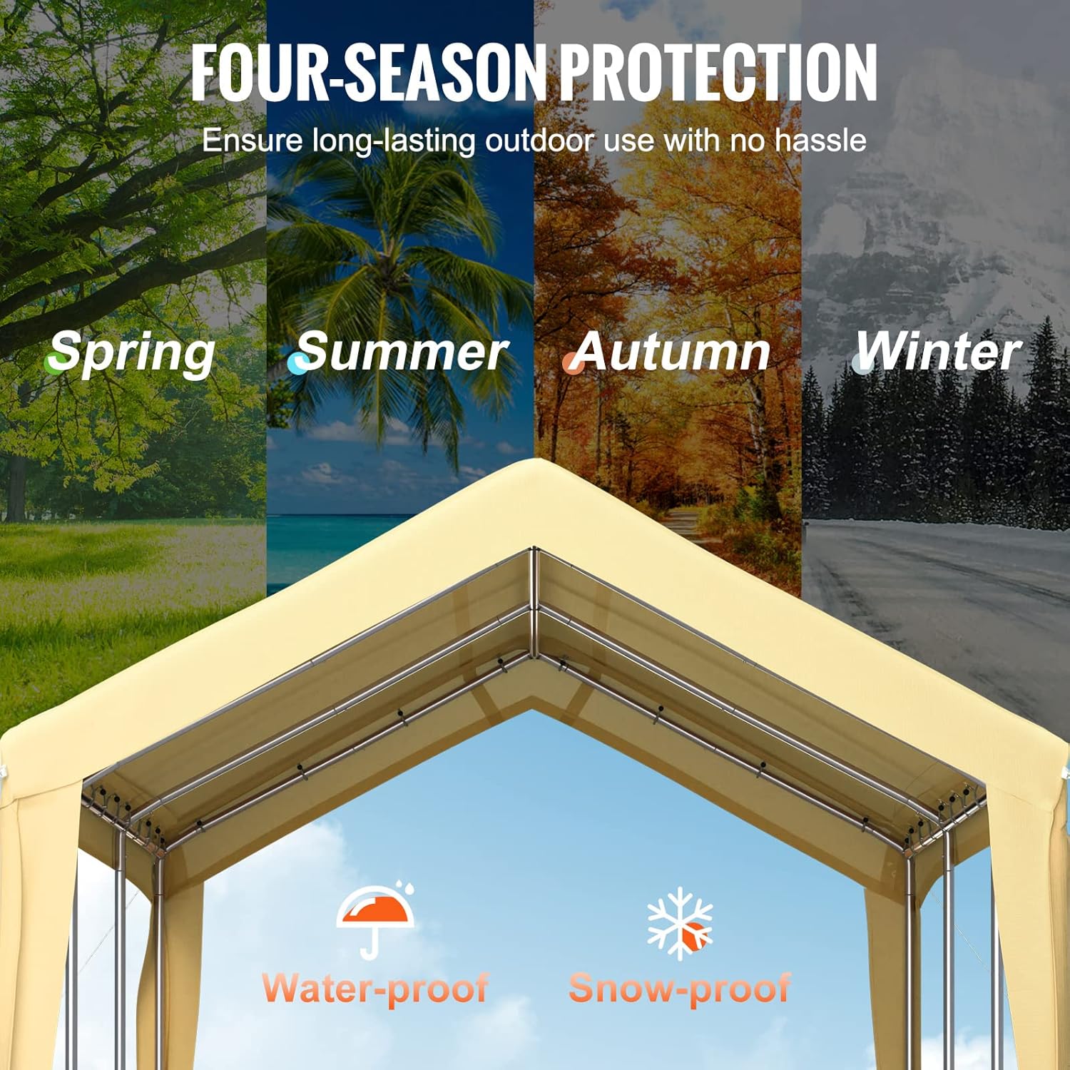 - Triple-layer Sun-proof PE Fabric: Made from 3 layers of heat-sealed PE fabric, our carport canopy cover is resistant to high temperatures, strong wind, and water. It is fade-resistant and doesn't tear easily, enabling the whole carport to accompany you for a long-lasting time.
