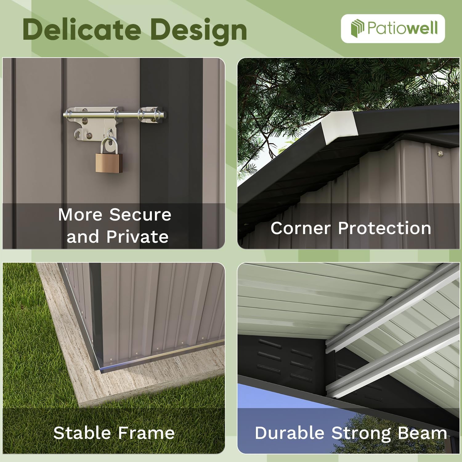- Multifunctional Outdoor Storage Shed: The large-capacity metal shed has multiple uses. It can store most of the outdoor tools you would normally use, such as lawn mower, bikes, toolboxes, etc. If you have pets, it can also be used as a pet house to keep out the wind and rain and provide enough warmth. You can also use it as a garbage room to keep your yard clean and tidy.