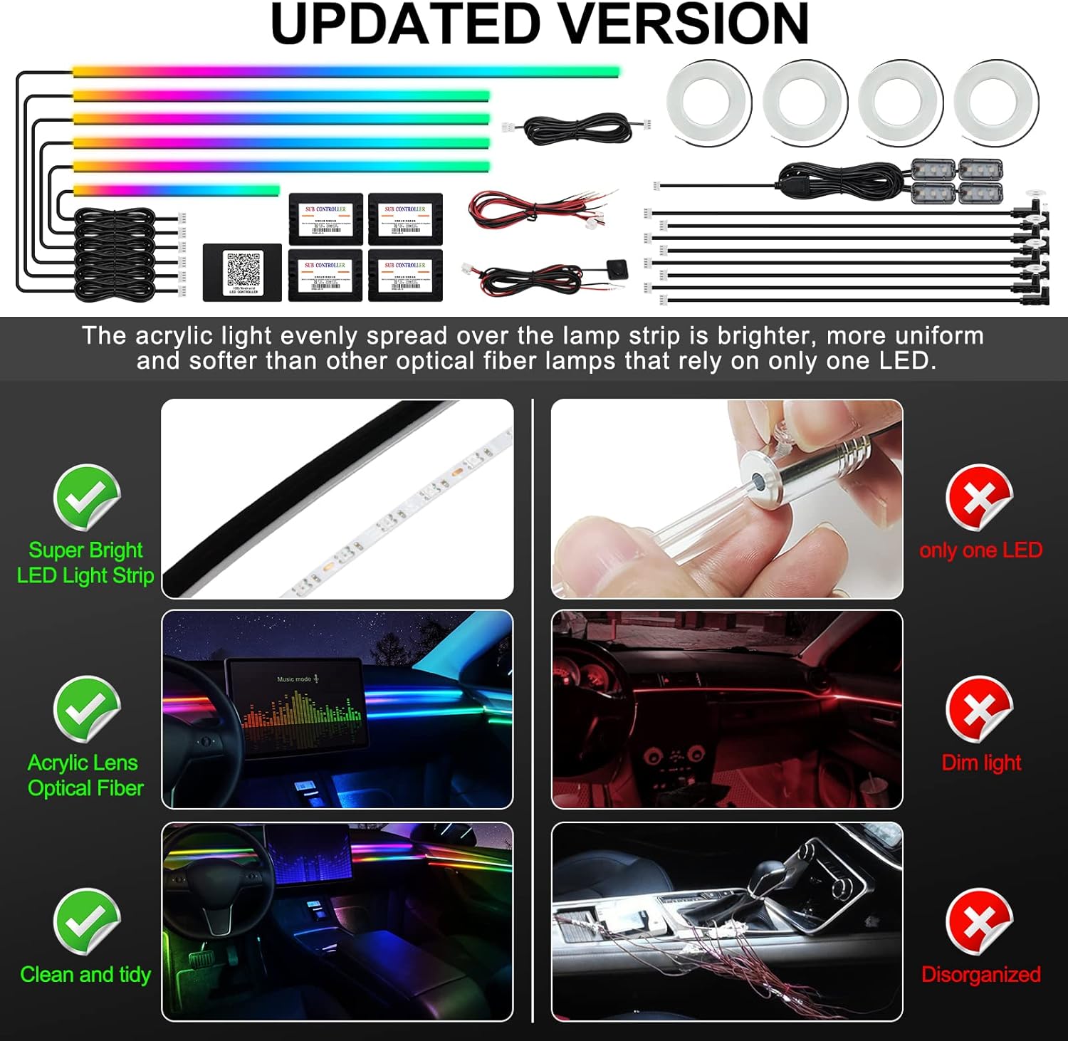 - ăHigh Bright & UniformăThe RGB Acrylic Light Strip have super bright LED and acrylic lens and contains 6 LED strips (4*29.5inch+1*43.3inch+1*14inch), Foot well lamp*4(44.5inch*2/64.2inch*2) and Door handle light*4+doors storage box light*4 (19.3+19.3inch)+Door horn light*4(5.9inch+ line 19inch*1), also comes with 1 main controller and 4 sub controllers,and can be flexibly installed on any car by DIY without disorganized, which is plug and play, and this acrylic light evenly spread over the lamp strip is brighter, more uniform and softer than other optical fiber lamps that rely on only one LED.