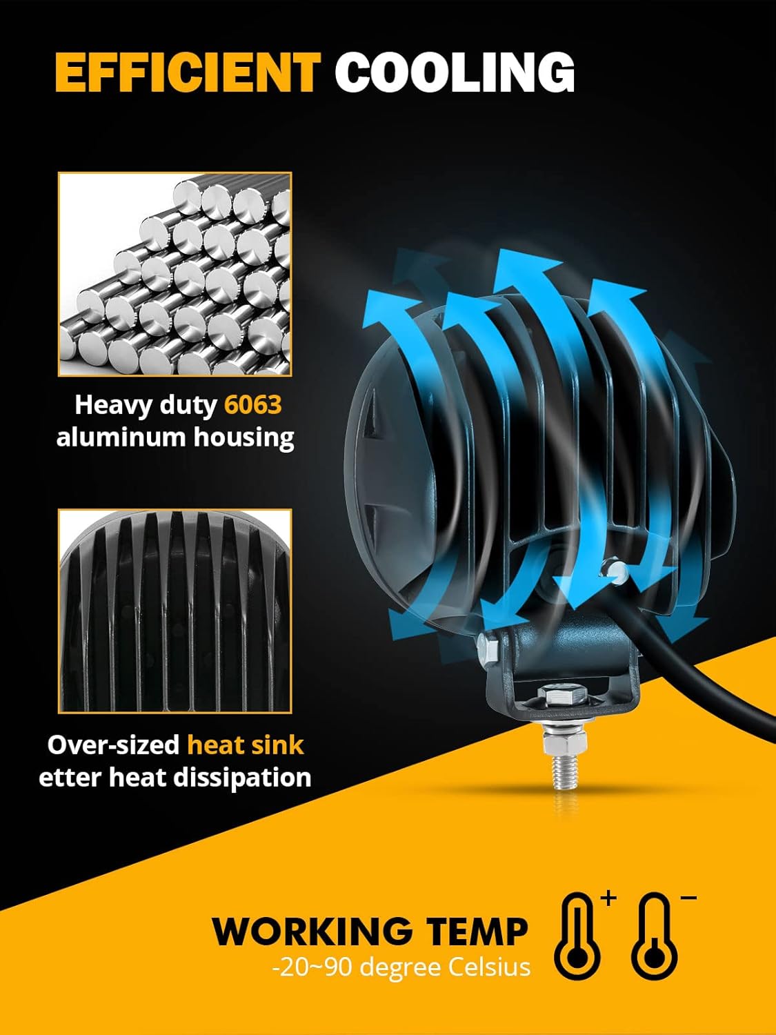 - 【LAST OVER 50,000 HOURS】Made of thickened 6063 diecast aluminum heat sinks, over sized heat-sink and breathing vent make lights fast running cooler. Even in harsh driving condition, it can still maintain an impressive 50,000 hour average life span.