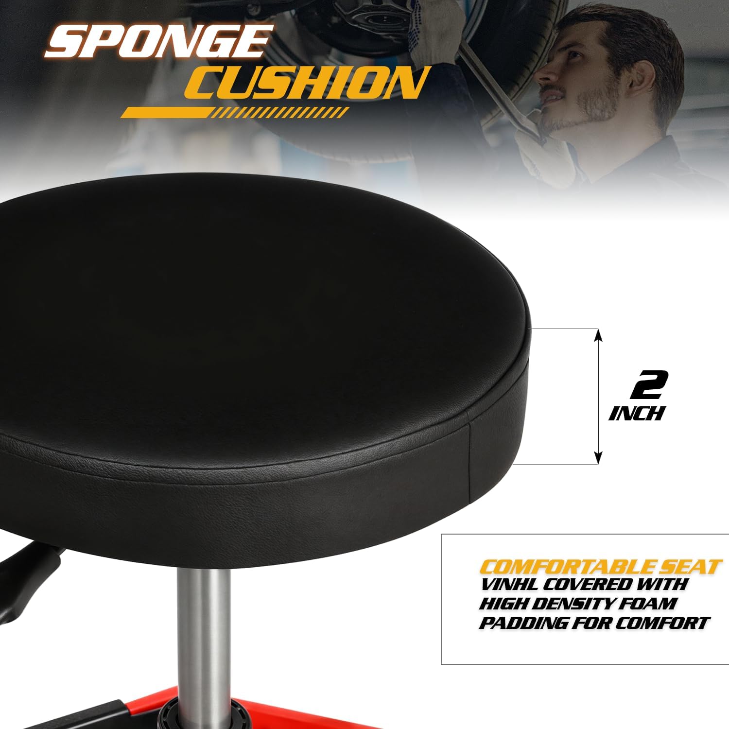 - Comfortable Padded Seat for Long Working Hours: Designed for extended use, this mechanics roller seat features thick, high-density foam padding covered in durable, easy-to-clean vinyl. The ergonomic design reduces strain on your back and legs, helping you stay focused and comfortable while working.