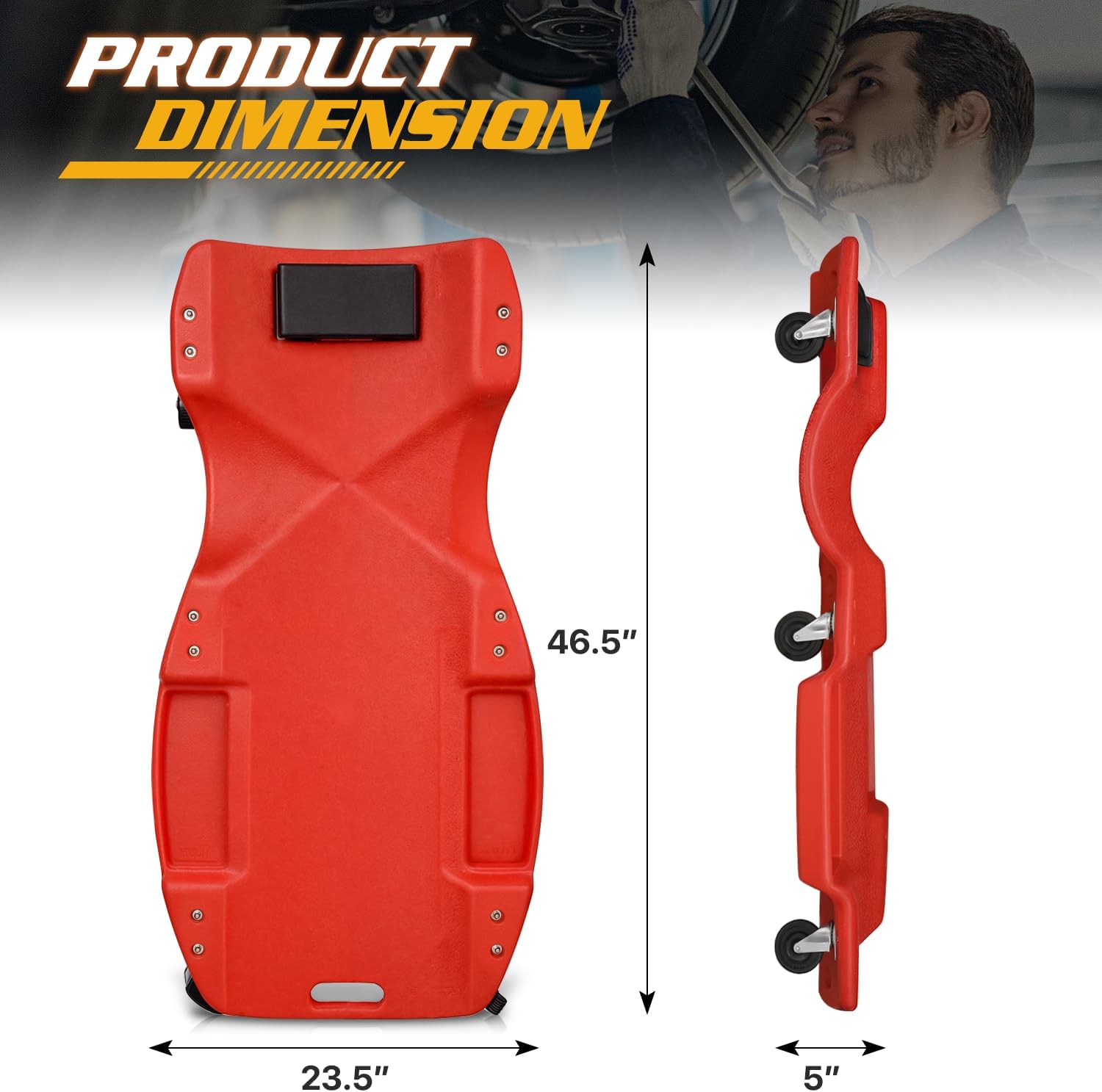 - The creeper measures 23.5"(D)×46.5"(W)×5"(H), has six 2.5" diameter wheels, and tool trays on both sides for your convenience.