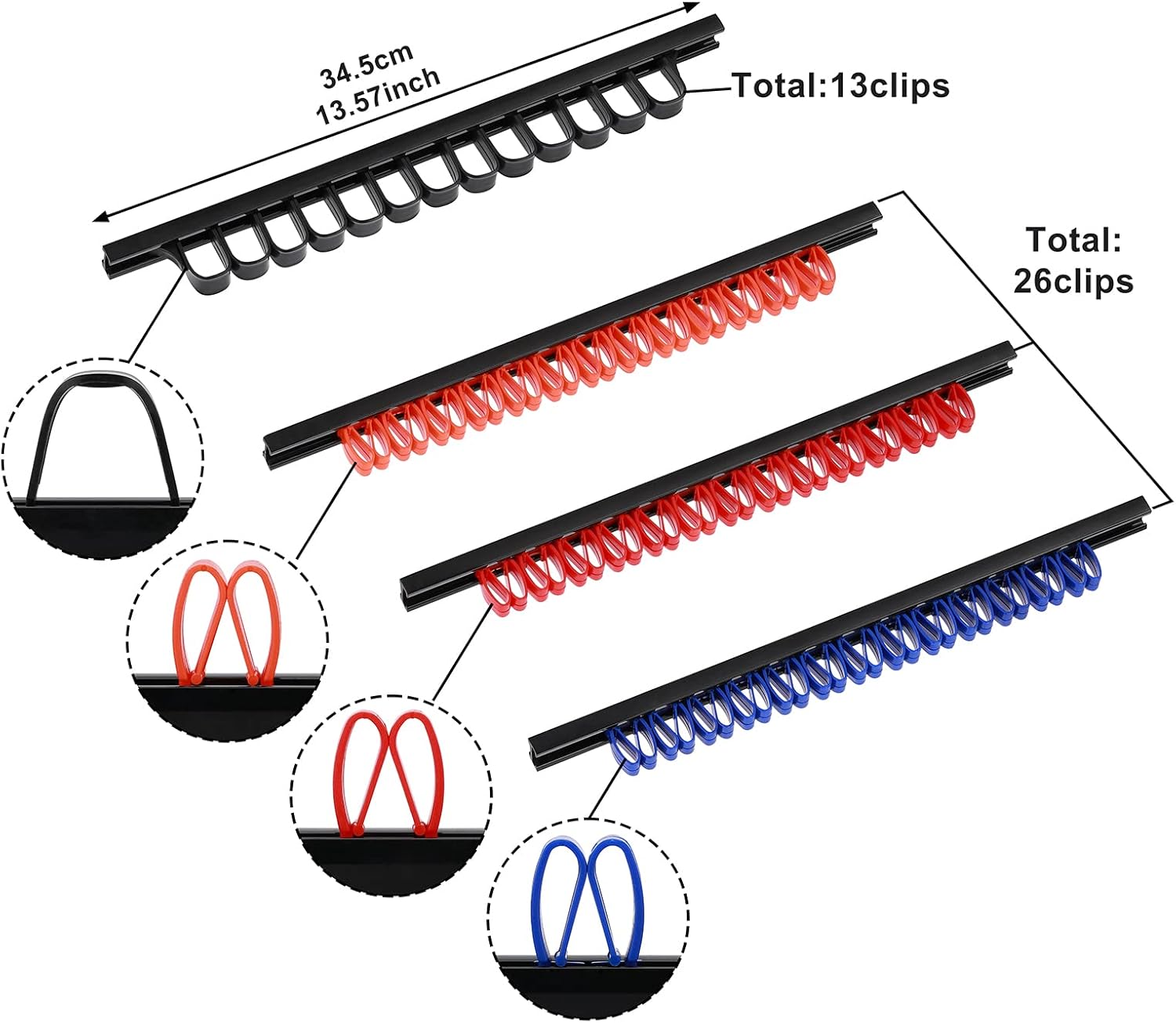 - Set includes 6 pcs screwdriver rails with 13pcs red clips, 13pcs organe clips, 13pcs blue clips and 4 pcs wrench rails with 52pcs black clips