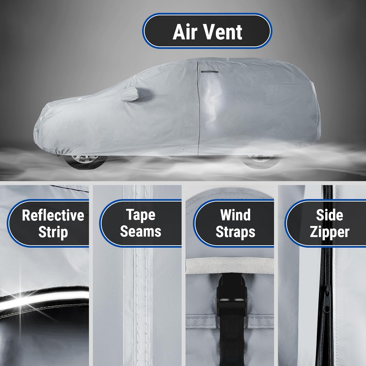 - SECURE YOUR VEHICLE WITH CONFIDENCE: Keep your car safe in all conditions. This cover comes with three heavy-duty straps that securely hold it in place during high winds, preventing it from shifting or flying off. You can trust it to protect your vehicle and give you peace of mind, even in tough weather.