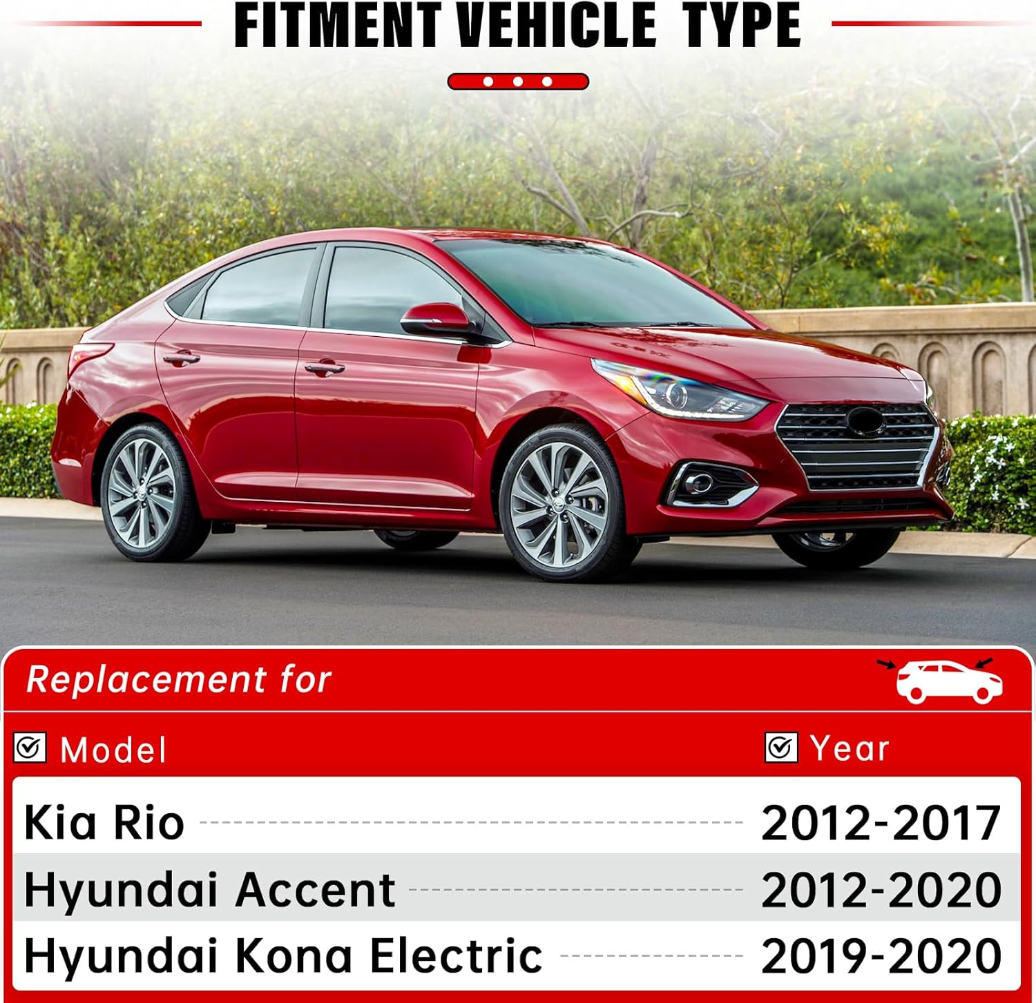 - Vehicle Service Type : Hyundai Accent 2012-2020, Hyundai Kona Electric 2019-2020, Kia Rio 2012-2017