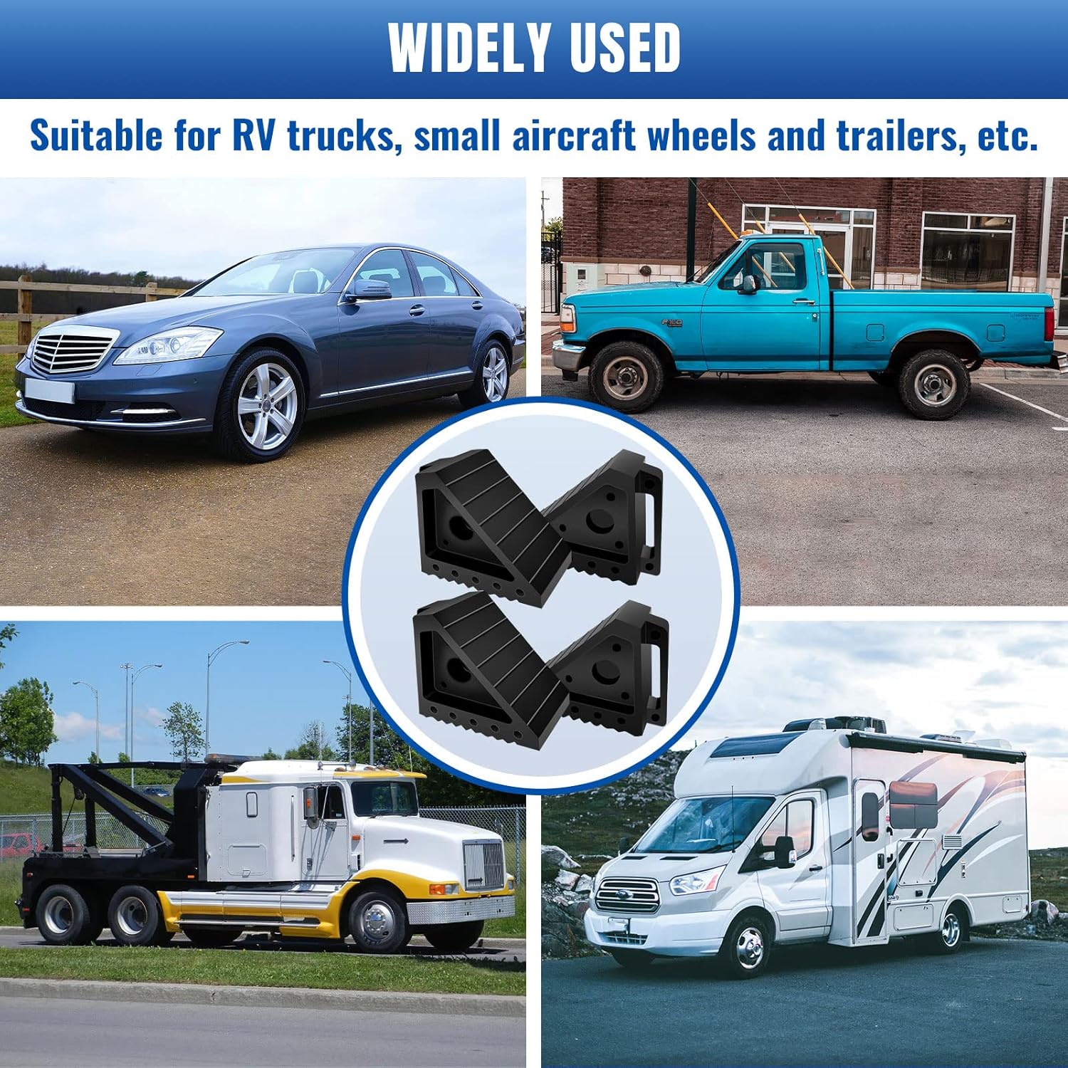 - WIDELY APPLICABLE: These leveling blocks are suitable for RVs, campers, trailers, cars, trucks, and small airplanes. Wheel chock can prevent the danger from rolling, make your travel more safer. The feature of versatility makes it possible to carry a limited number of tire gears and can be used in multiple places