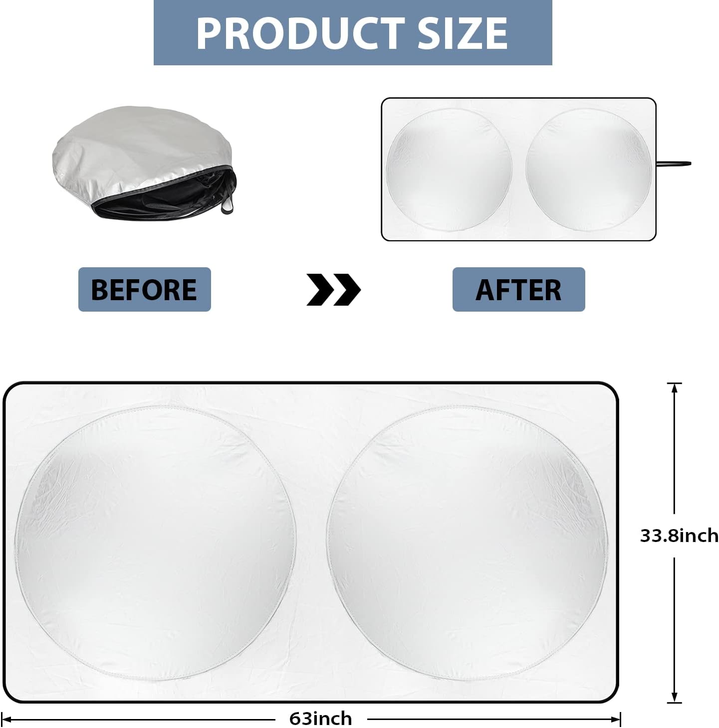 - The Suitable Size for SUVs: Our car sun shade windshield seamlessly accommodates your vehicle, providing shade and comfort regardless of the bad weather. It measures 63x34 inches for your sun visor for car.