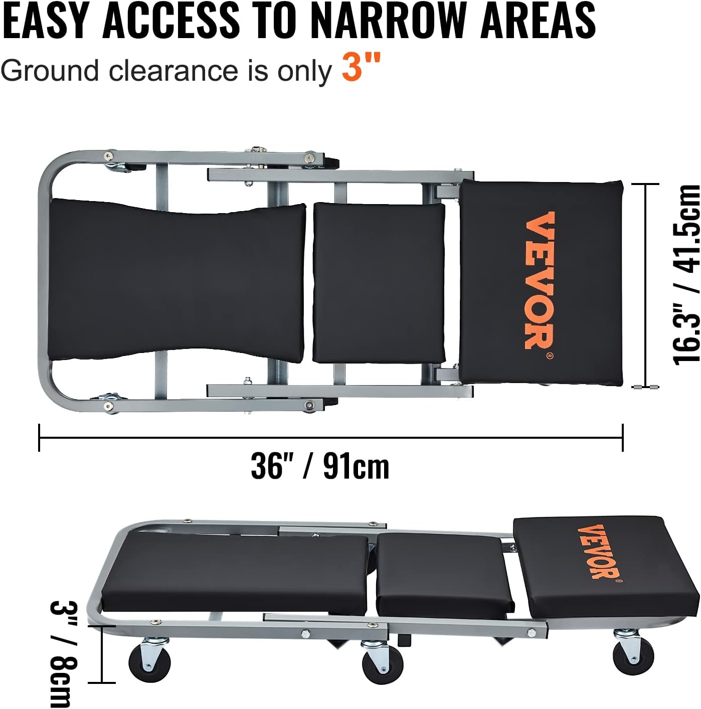 - A Helping Hand: Ground clearance of the creeper is only 3 inches, allowing you to reach a narrow and low clearance space. The creeper seat is widely used in garages and repair shops to help you repair vehicles. Get your vehicles back to their prime with VEVOR!