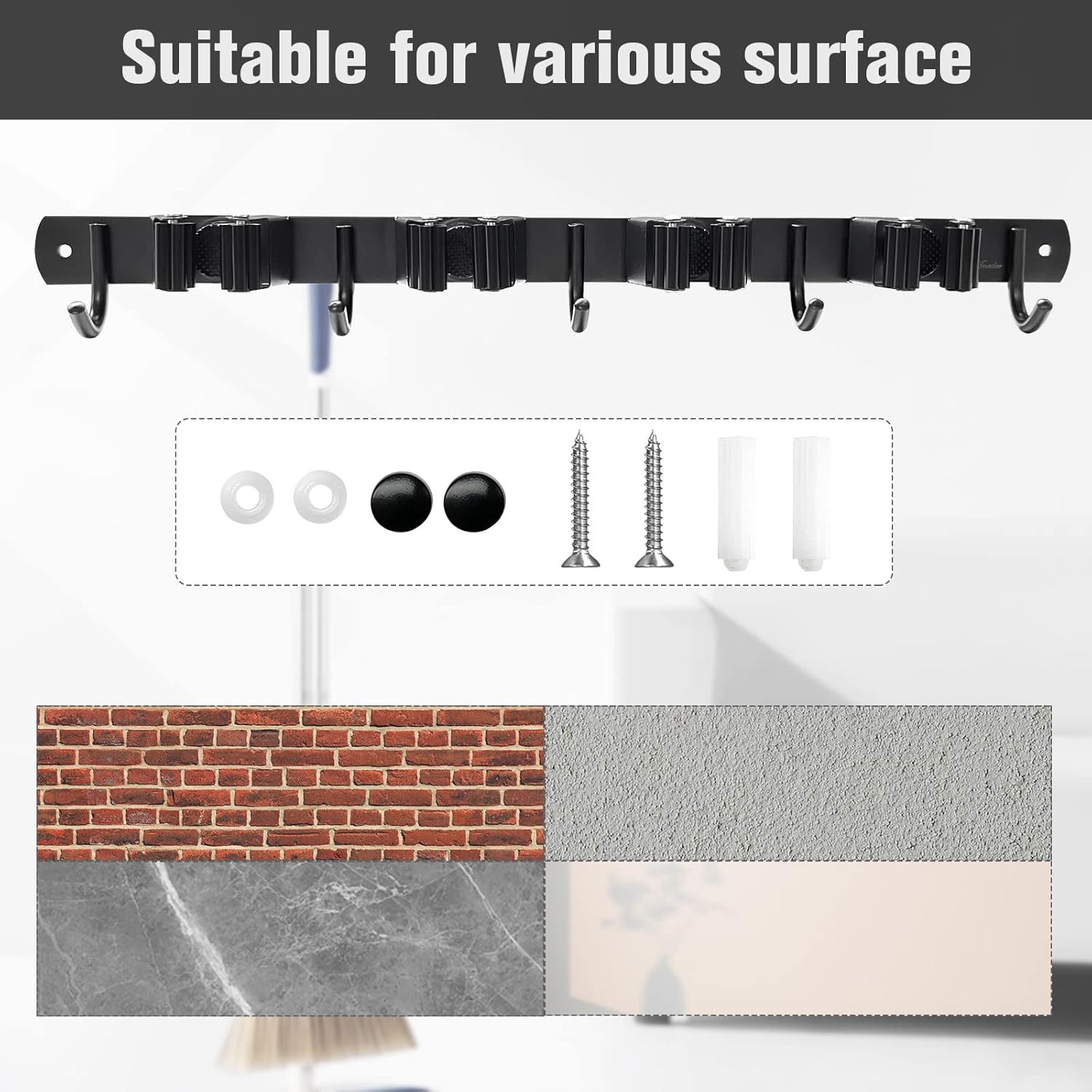 - 【Easy Installation&Great Design】Using screw drilling to install the mop holder wall mounted within minutes suitable for most surfaces. Simple and unique design,perfect for your garage, garden,bathroom, kitchen,door and pool etc.