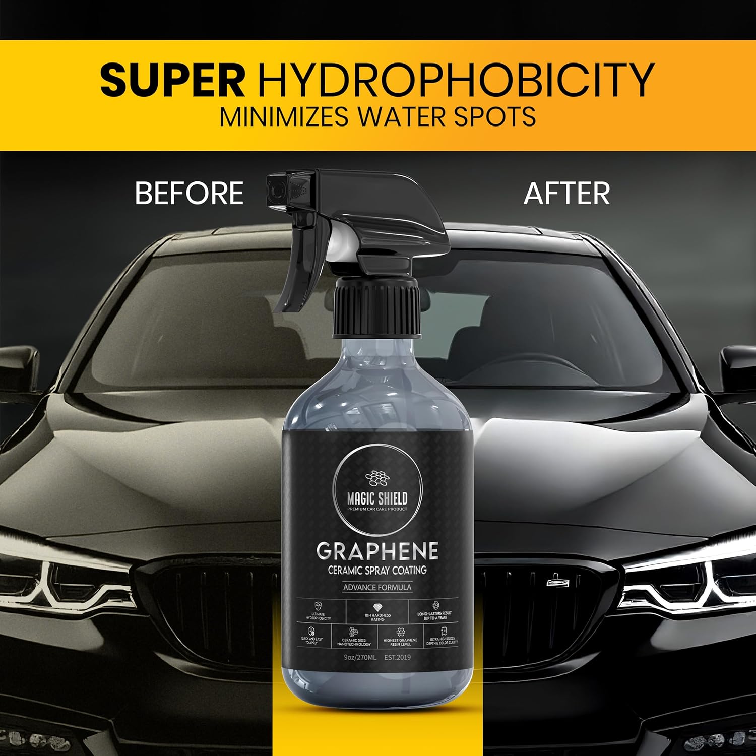 - โณ Long-lasting Protection: Magic Shield Graphene Spray's advanced graphene-based formula creates a protective layer that defends against scratches, chips, and other damage, ensuring prolonged beauty for your vehicle.