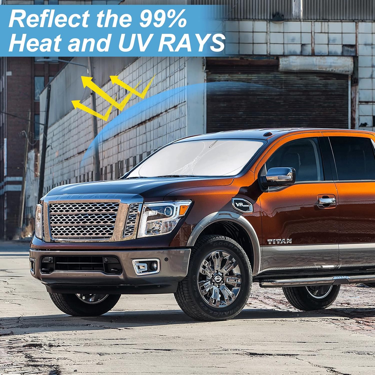 - - 🚗【SUPERIOR UV PROTECTION] 】Made from 210T reflective fabric with UV reflective material and two-layer heat insulation, this sun shade provides 99% SPF protection to keep the car cool and protect the dashboard from fading or cracking. It blocks 98% of the harmful UV rays. Our Tundra SUV car accessories sunshade maintains your car's interior temperature at an optimal level.
