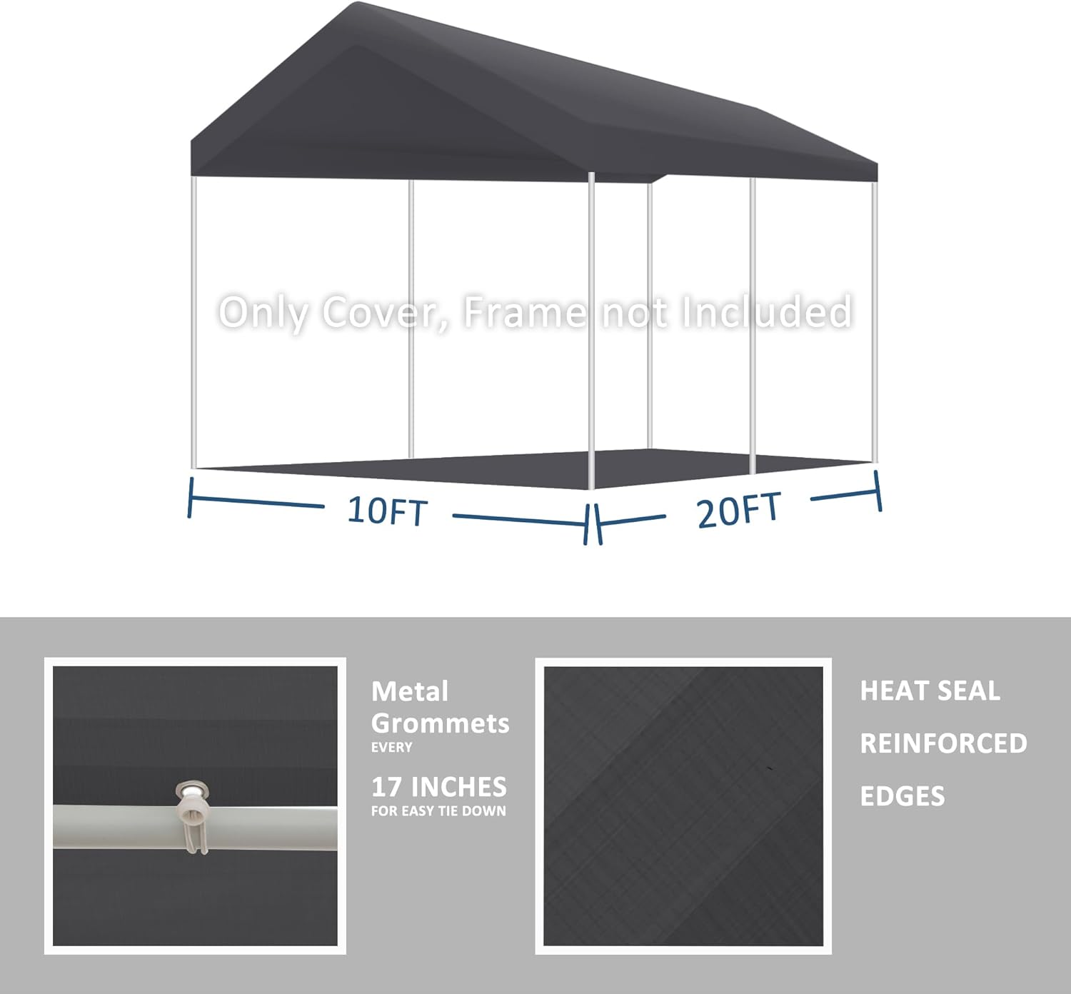 10' x 20' Upgraded Carport Replacement Canopy Cover Grey for Car Garage Shelter Party Tent Top Tarp with Ball Bungees (Only Top Cover, Frame is not Included)