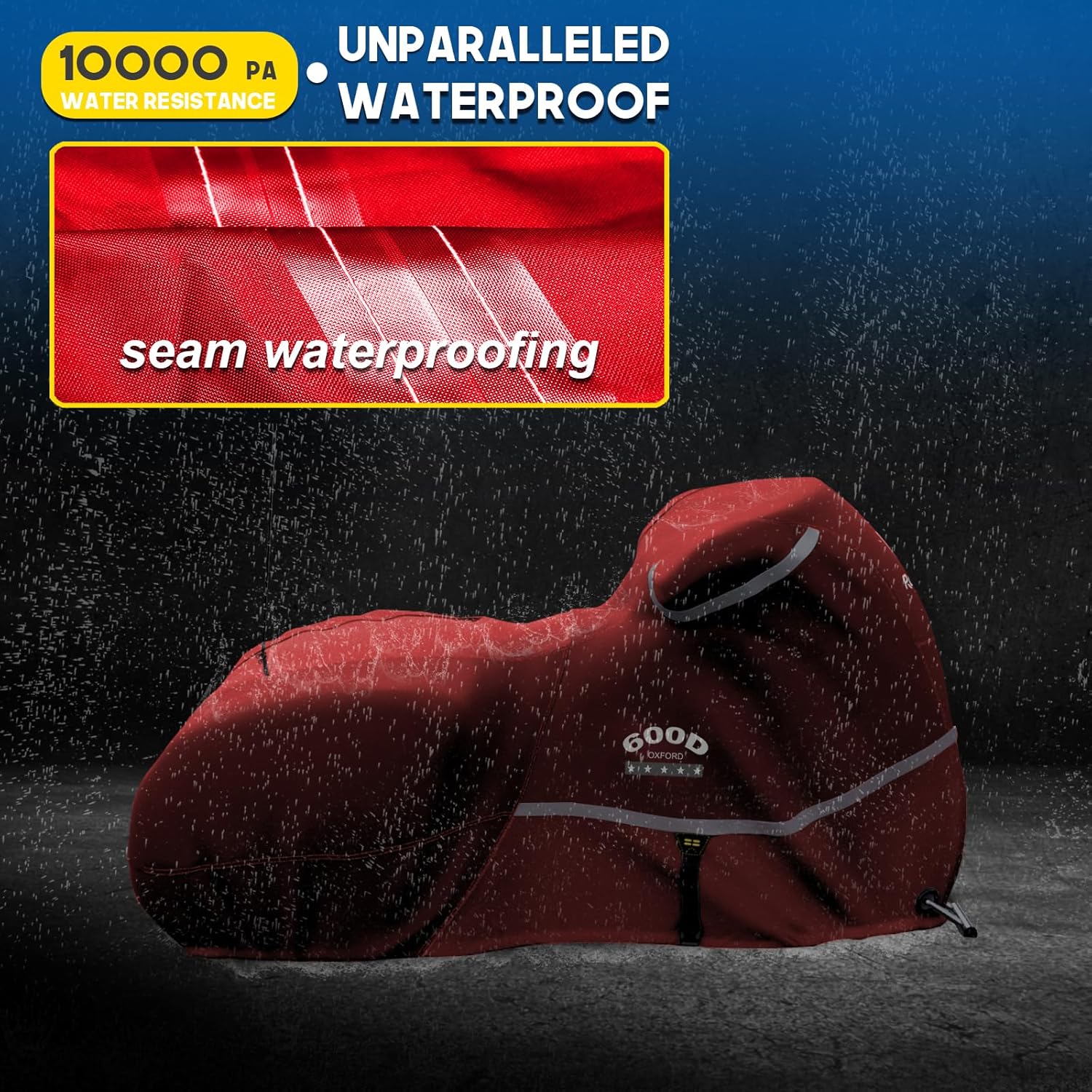 - 🛵【Waterproof and Windproof】:The material used in motorcycle cover is 600D multi-layer Oxford cloth, with the seam applied with glue,so it is rainstorm-proof. Adjustable Hem Cord at the lower hem of the cover can press the cover against the bike body closely. In addition, there is a buckle at the bottom to prevent the cover from being blown away.