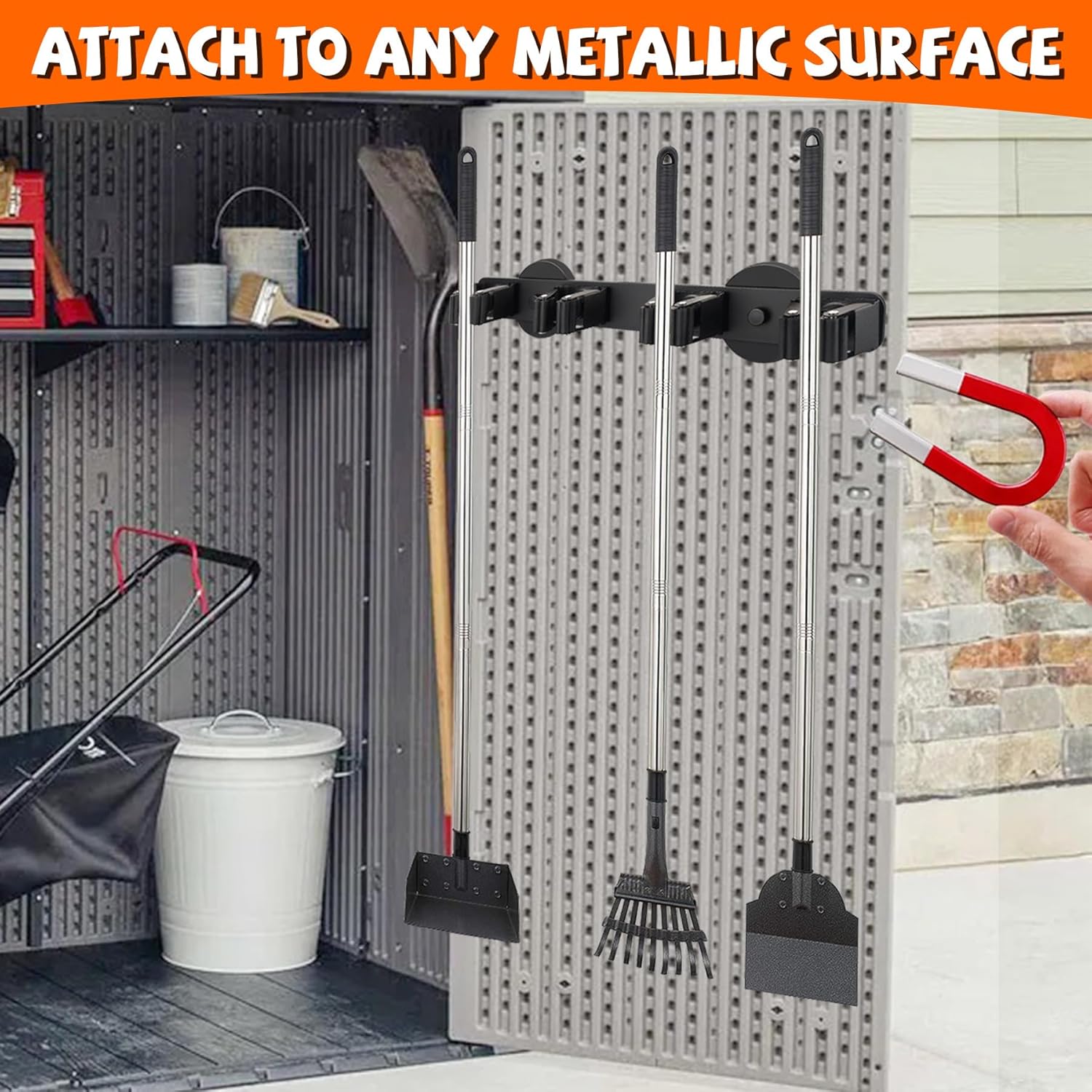 - [Magnetic Mount Broom Holders]: Heavy Duty magnetic broom holder is made of aluminum alloy,sturdy and lightweight, 4 rakcs can accommodate various sizes of brooms,mops and others tools. You can easily adjust the position of the tools to find the best fit