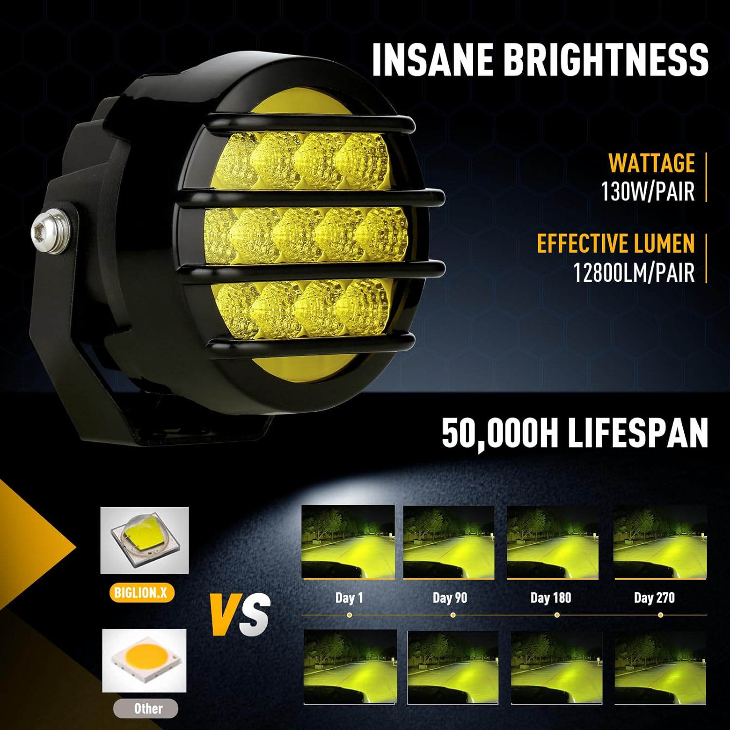 - ăHIGH STANDARD WATERPROOF GRADEăAmber fog lights conform to IP68 and IP69K standard. 4 inch led pods applied military breather design to prevent condensation and fogging. Lengthen biglion.x 4 inch life. Balance light barâs differential pressure to achieve thermal balance is attained. Let the sealed lamp beads have better heat dissipation. Enhance the usage of reliability in extreme environment.