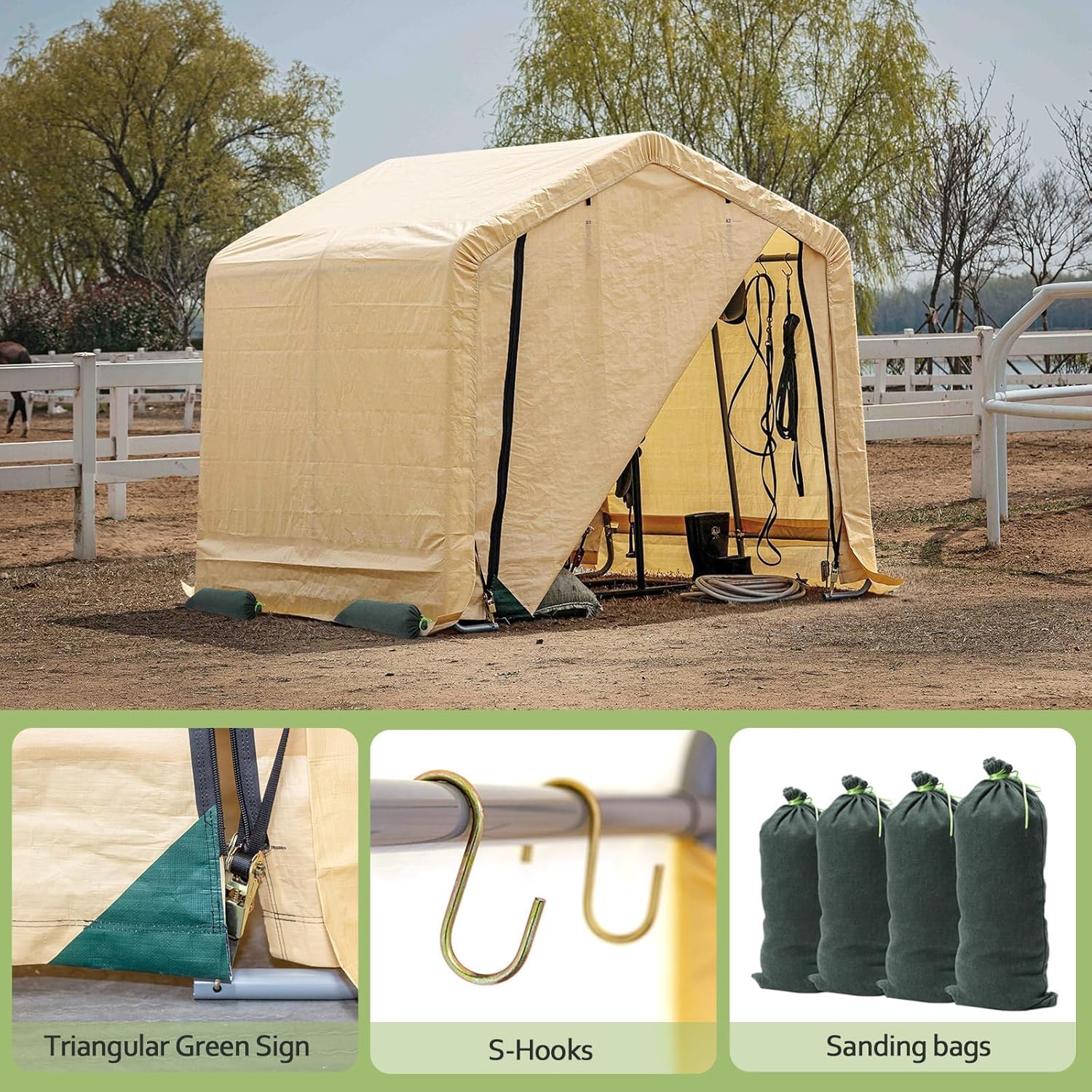 - Spacious Storage Capacity: Measuring 8 ft x 8 ft x 7 ft, the outdoor portable garage provides spacious storage space for motorcycles, bicycles, garden tools, lawnmowers, firewood, and patio furniture. It could be used as a portable motorcycle storage shed, ATV storage shed, bike storage shed, small vehicle garage shelter