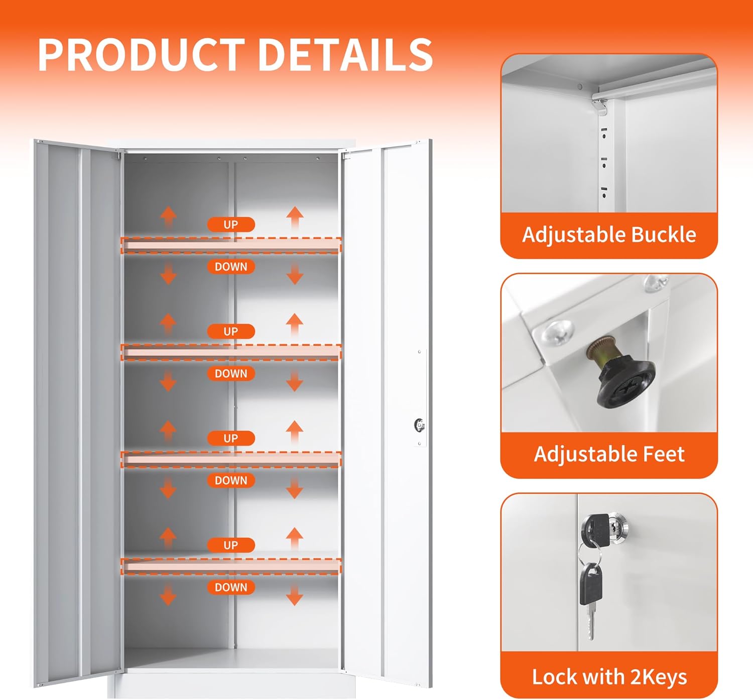 - ćDurable & Strong ConstructurećThe storage cabinet with doors and shelves is made of reinforced steel frame which is rugged and not easily deformed, the max weight capacity each shelf is up to 121lbs, surface adopted environmentally powder coated finish, Moisture proof and rust.