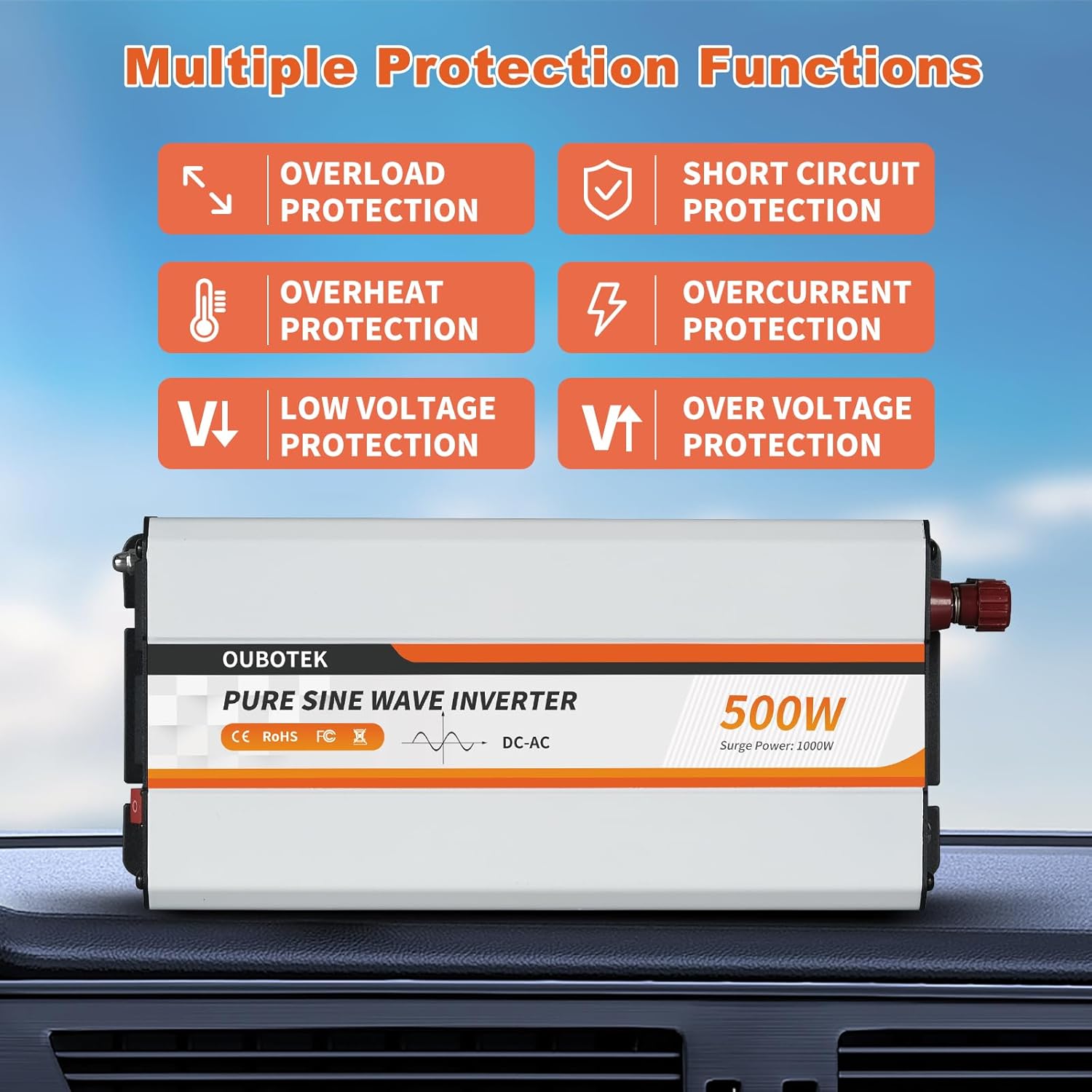 - SAFETY PROTECTION: The 500 Watt Inverter Intelligent chip and built-in 2*40A fuse to protect your device, our safety design ensure that your devices are protected from low voltage, over voltage, over load, short circuit and over temperature.