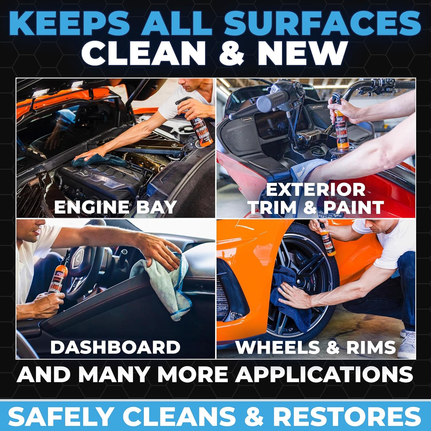 - π EXTEND THE LIFE OF YOUR VEHICLE: Your car or motorcycle is more than just a mode of transportation β it's a valuable investment. Protect its interior and exterior with ease using this convenient and powerful all-purpose cleaner. Comes with 2 complementary edgeless Premium Microfiber Towels (380 GSM, 16x16 inch) for safe and effective application and drying, ensuring a flawless finish every time.