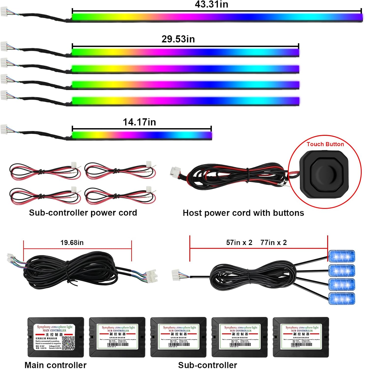 - Included Components : 6 acrylic fiber optic light strips, 4 car interior foot well lights, 1 master controller, 4 sub controllers, and installation tools 6 acrylic fiber optic light strips, 4 car interior foot well lights, 1 master controller, 4 sub controllers, and installation tools