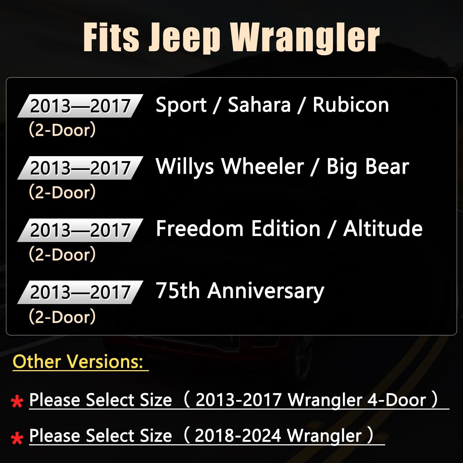 - ăCUSTOM FITă - A full set of seat covers customized according to the original car seat size 1:1, which will fit Wrangler JK 2-Door 2013 2014 2015 2016 2017 like a glove.