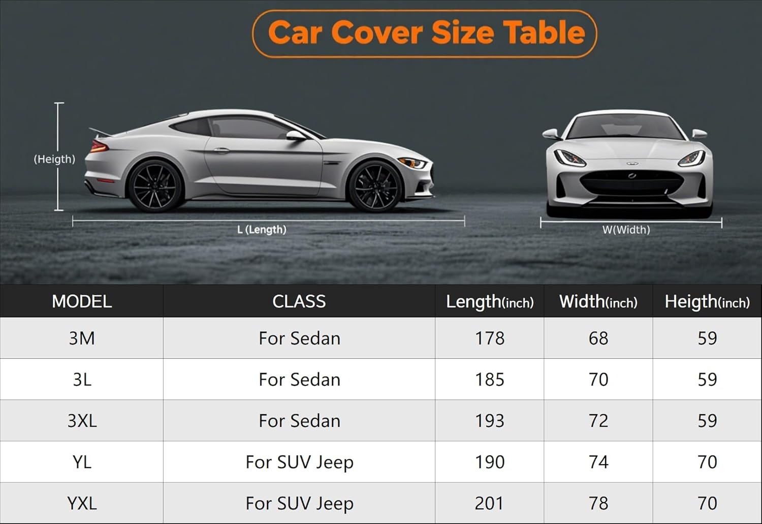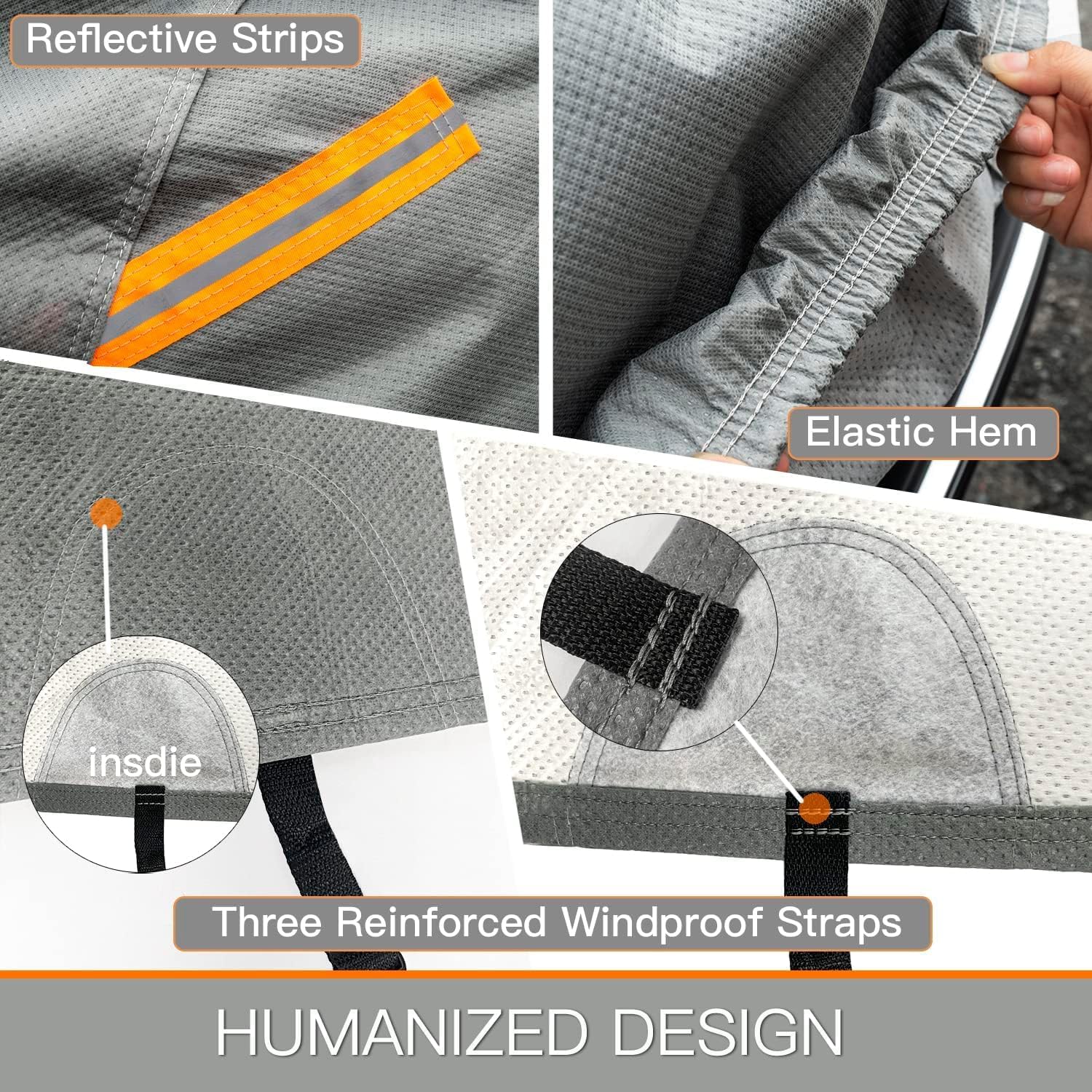 - ăUnique Designă1.Three windproof belts can protect your car cover from being blown away by strong winds. 2.Double seam technology is used to make the car cover more tightly stitched and more durable than most similar covers. 3. 4 transverse orange reflective strips ,remind other people in the night, avoid accidents in dark environments. 3.The elastic hem at the bottom makes the car cover fit the car better.