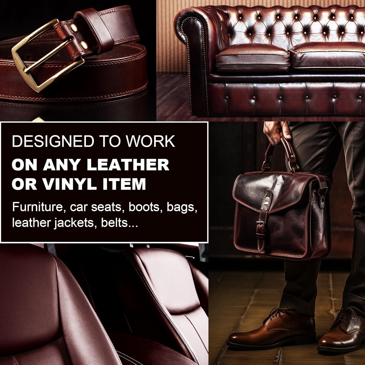 - Versatile Use: Our Leather Repair Kit is perfect for a wide range of leather and vinyl items, such as sofas, couches, car seats, wallets, shoes, boots, tool bags, saddles, belts, jackets, armrests, gloves, and more. It’s ideal for all types of leather restoration needs, including fixing scratches, recoloring, fading, and regular maintenance.