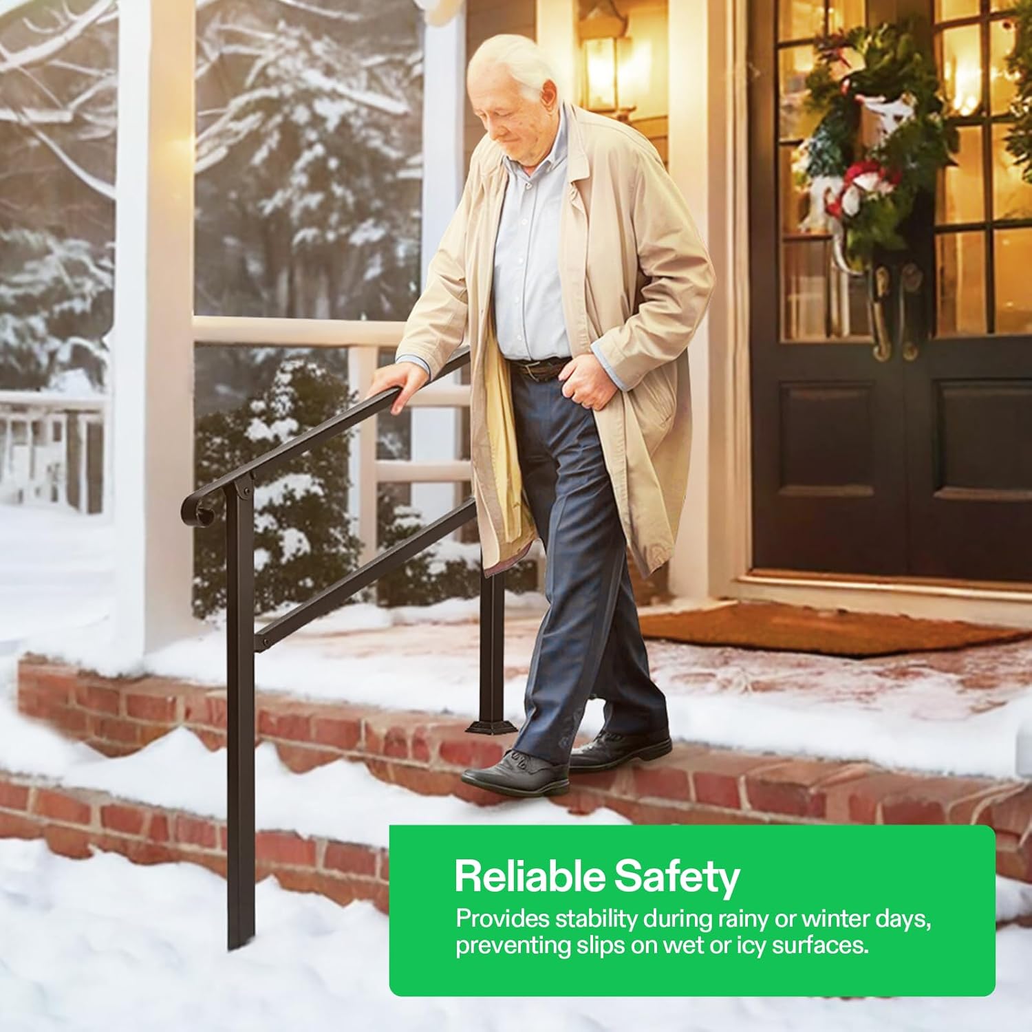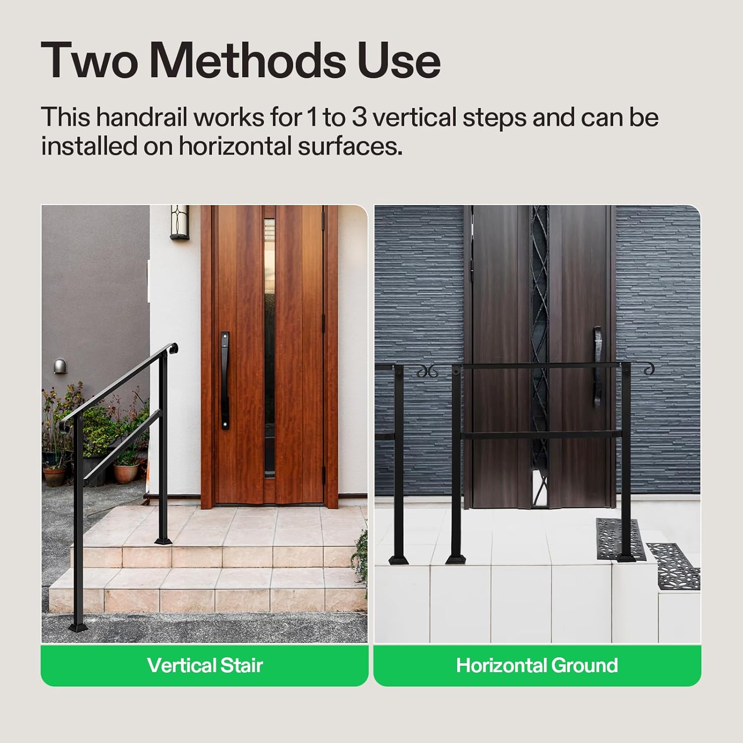 - Sturdy & Durable: Made of high-quality iron for stability and durability, this handrail is capable of withstanding harsh outdoor conditions, including rain and snow; Thick black powder coating reduces chance of peeling off, rust, scratches, and discoloration, also making the railing easy to maintain and clean