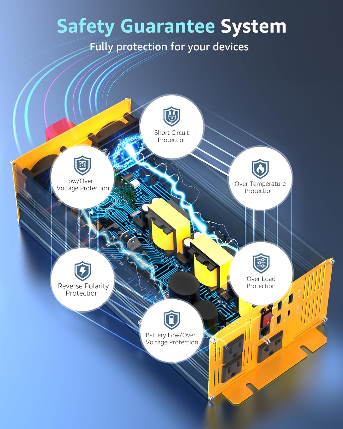 - ăFULLY SAFETY PROTECTIONSă Pure sine wave inverter has passed FCC CE ROHS PSE certification. Designed with isolated input/output stable design offers under-voltage protection, overvoltage protection, overload protection, overheating protection, and short circuit protection to ensure safety.