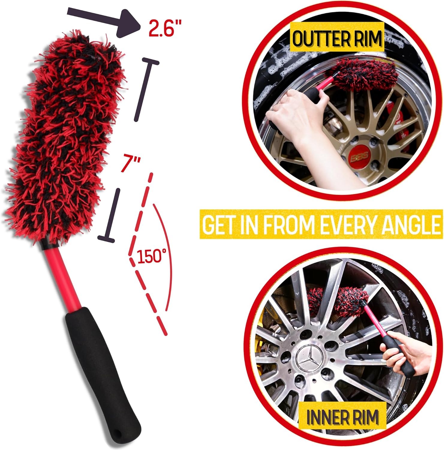 - PREMIUM MATERIALS ALWAYS READY FOR NEXT CLEANING JOB: The microfibers angle wheel brush allows you to use more intense chemical products on wheels without the worry of damaging your brush! The fibers are excellent at holding in suds to make washing your wheels a breeze. After cleaning your rims, just simply rinse these brushes with water to complete the cleaning process