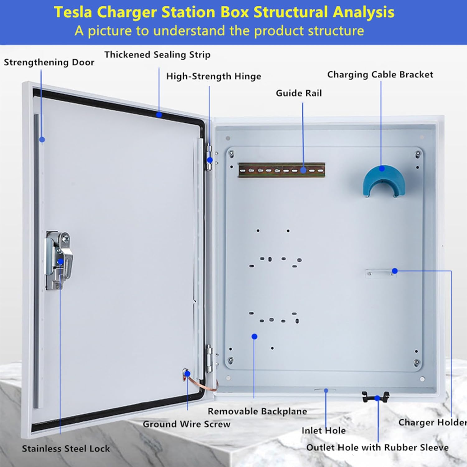 - Security and Durability: The outdoor cable box adopts a combination lock to eliminate the risk of key loss and theft, increasing security and lockability. A high-strength hinge, reinforced door and precise craftsmanship, this box provides security and durability for your Tesla charger, protecting it from theft and the elements.