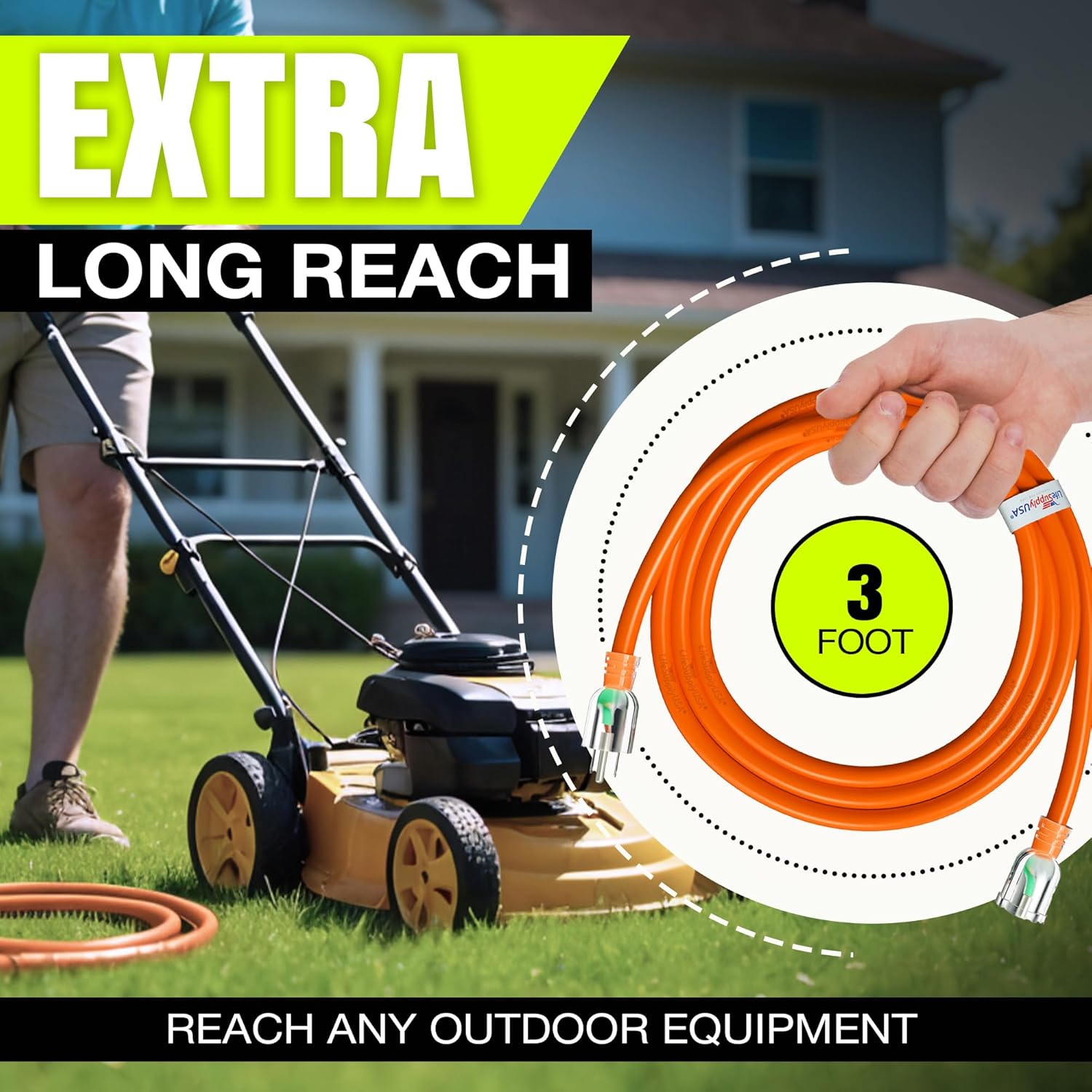 - POWERFUL: This 3FT, 10 Gauge 3-prong SJTW, Orange extension cord is designed for extra safety and durability, The cable extension electrical cord supports 15 AMP, 125 Volts, and up to 1875 Watts, ensuring robust performance for high-demand equipment, this 1 Pack embodies reliability, quality, and the grounded power to handle your most challenging projects with ease.