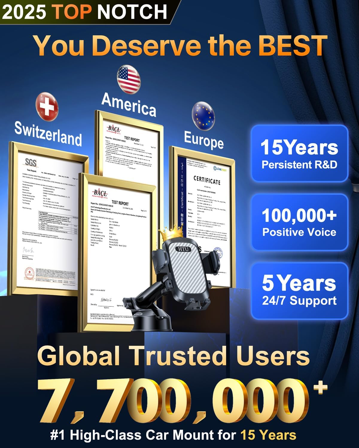 HTU 2025 Best Car Phone Holder 【Ultimate 5-in-1 & Upgraded 100+LBS Strongest Suction】【True Military-Grade & Safety Cert】 360° Windshield Dashboard Vent Mount Stand for iPhone Android & Truck, Grey