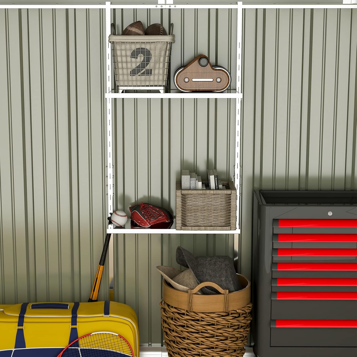- 【Superior Durability】The tool shed is crafted from high-quality, corrosion-resistant metal that stands up to adverse weather conditions including rain, snow, and sun exposure. This robust construction not only extends the life of the shed but also ensures that your tools and equipment are protected from environmental damage.