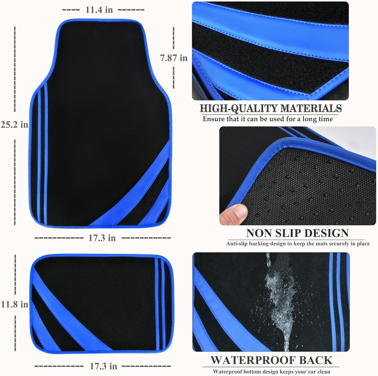 - ăHigh QualityăThe edges and blue lines are made of leather and double stitched for superior quality. The center carpet portion is soft and thick, which traps dust and dirt well and Protect your vehicle's flooring against spills, stains, dirt and debris.