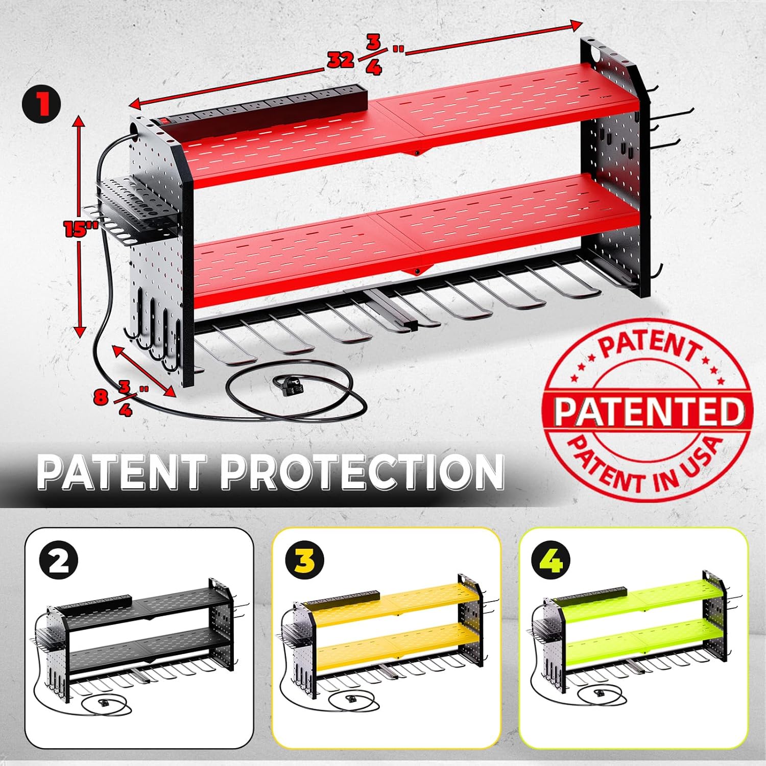 KAFAHOM Power Tool Organizer with Charging Station, Built in 8 Outlet Power Strip, Large 8 Drill Holder Wall Mount, Heavy Duty Metal Power Tool Storage Rack Tool Shelf for Garage Organization Red