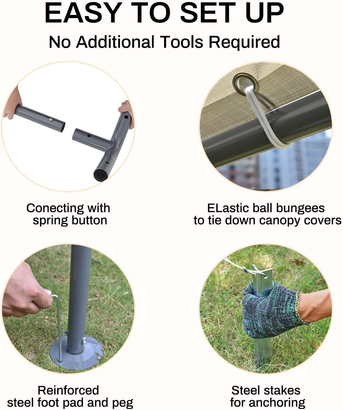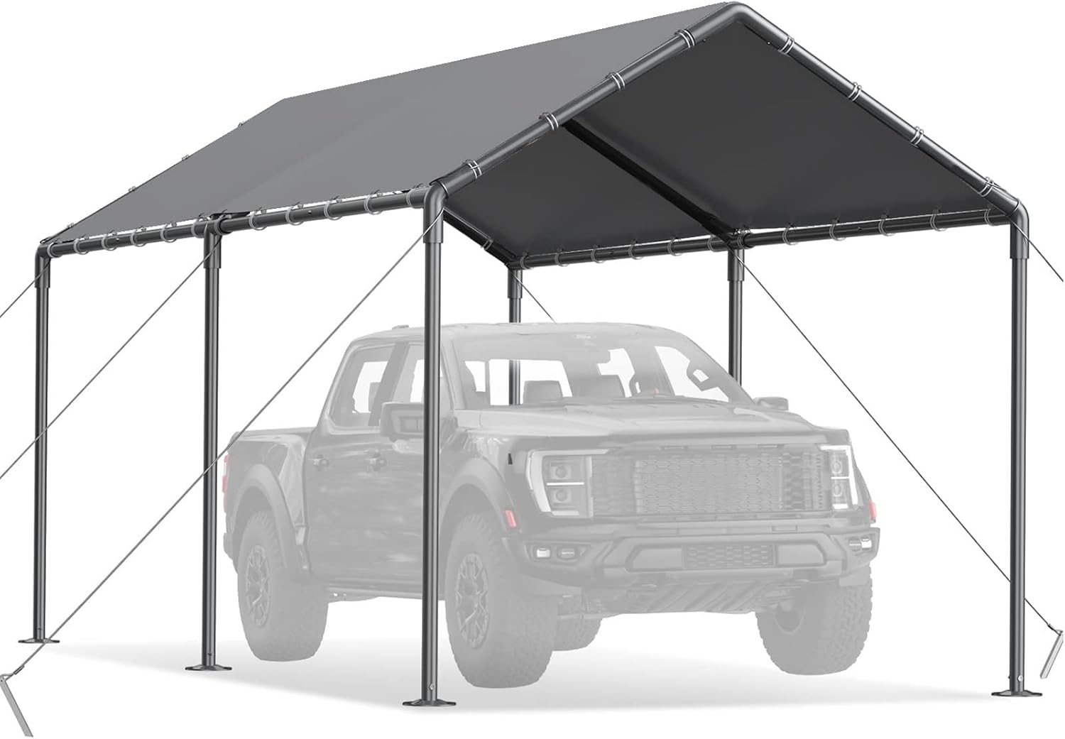 - 【Stability Design】This Carport is Supported by eight heavy-duty galvanized metal poles, The frame connector uses art-welding, elastic ball strap fastens the canopy to the frame, Come with ground stakes and guy ropes for extra support. keep your belongings safe and secure