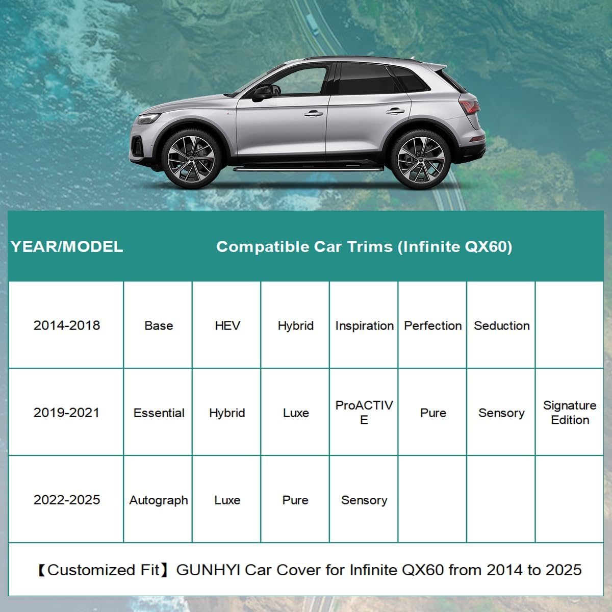- ăCompatible withăThis Full Car Cover Custom fit for Infiniti QX60 from 2013 to 2025. Comes with a microfiber towel that you can use to clean your car, because if there is sand on the surface of the car before use, it may damage the paint.